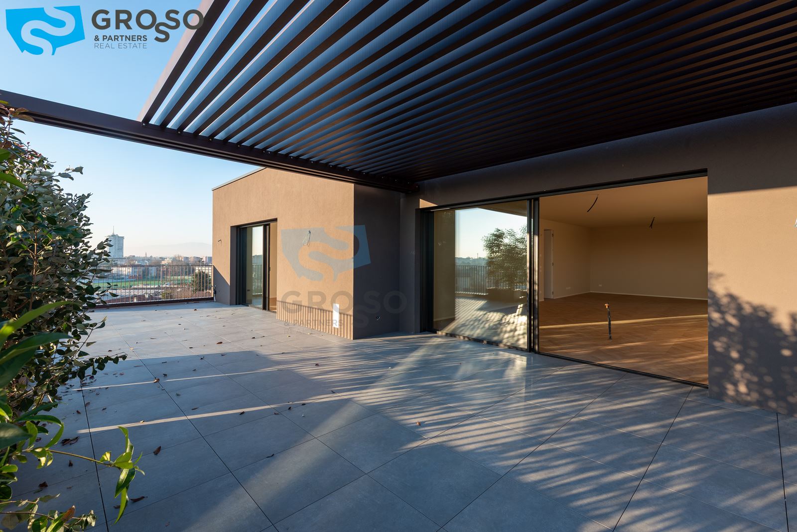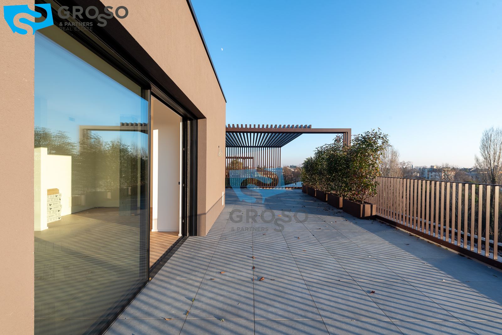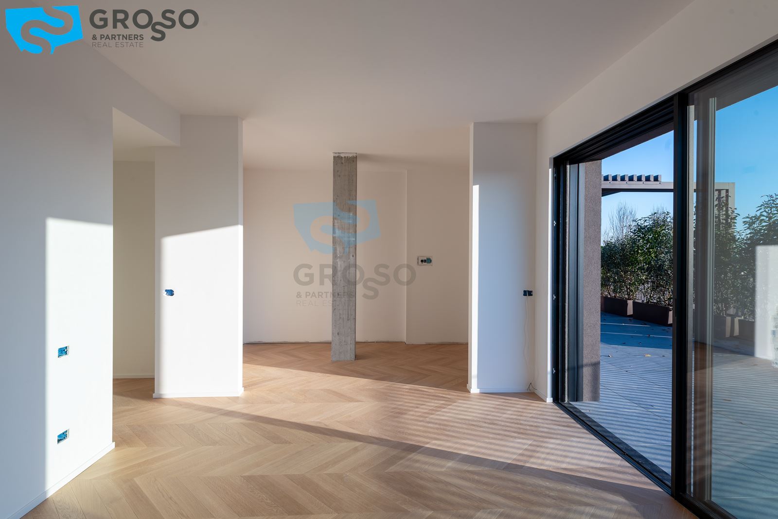 L'attico si compone di un ampio salotto con angolo cottura, tre camere, di cui due matrimoniali e una singola, e tre bagni. Completa l'immobile un'ampia terrazza abitabile, un garage doppio e un posto auto di proprietà.
