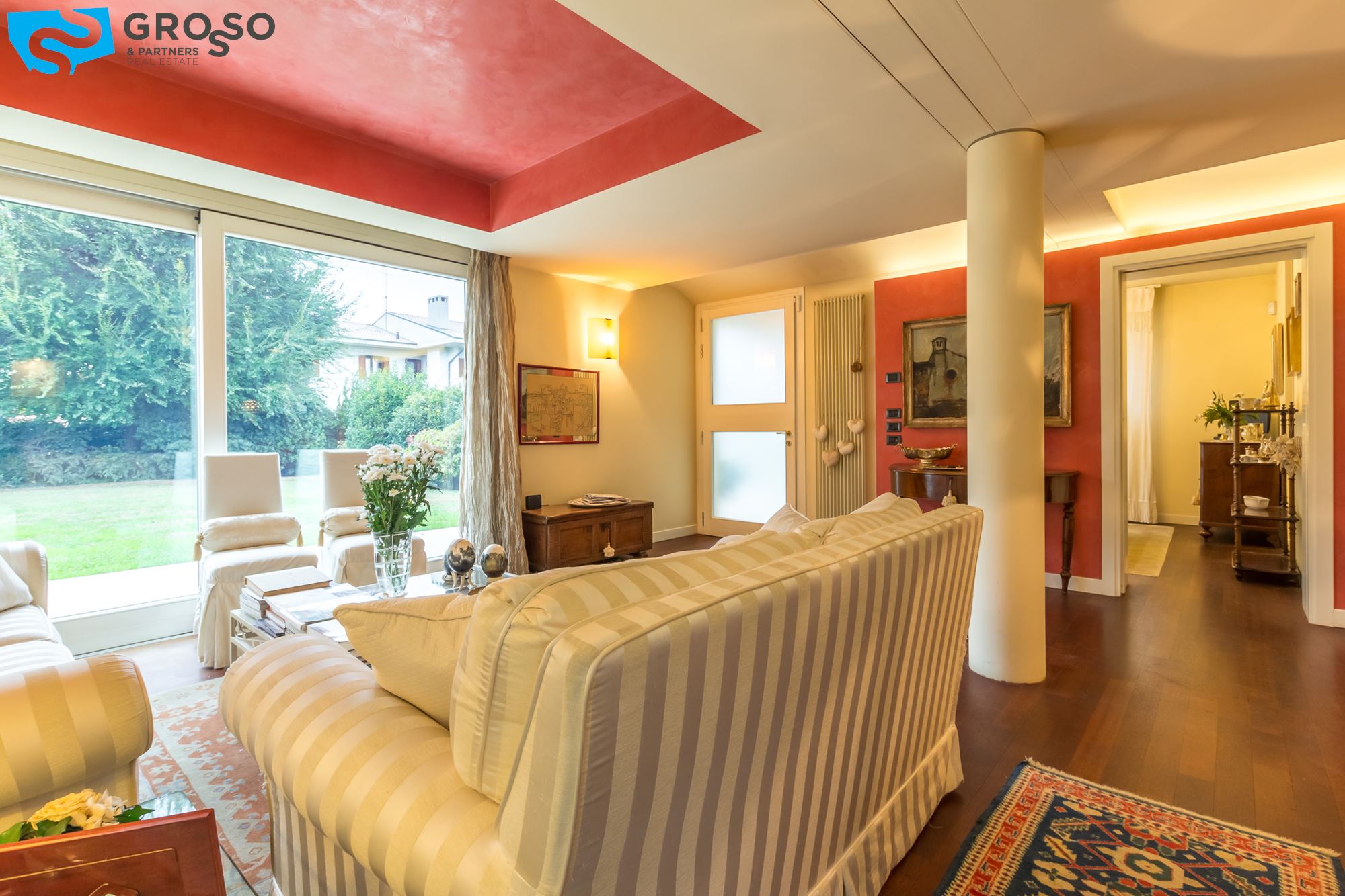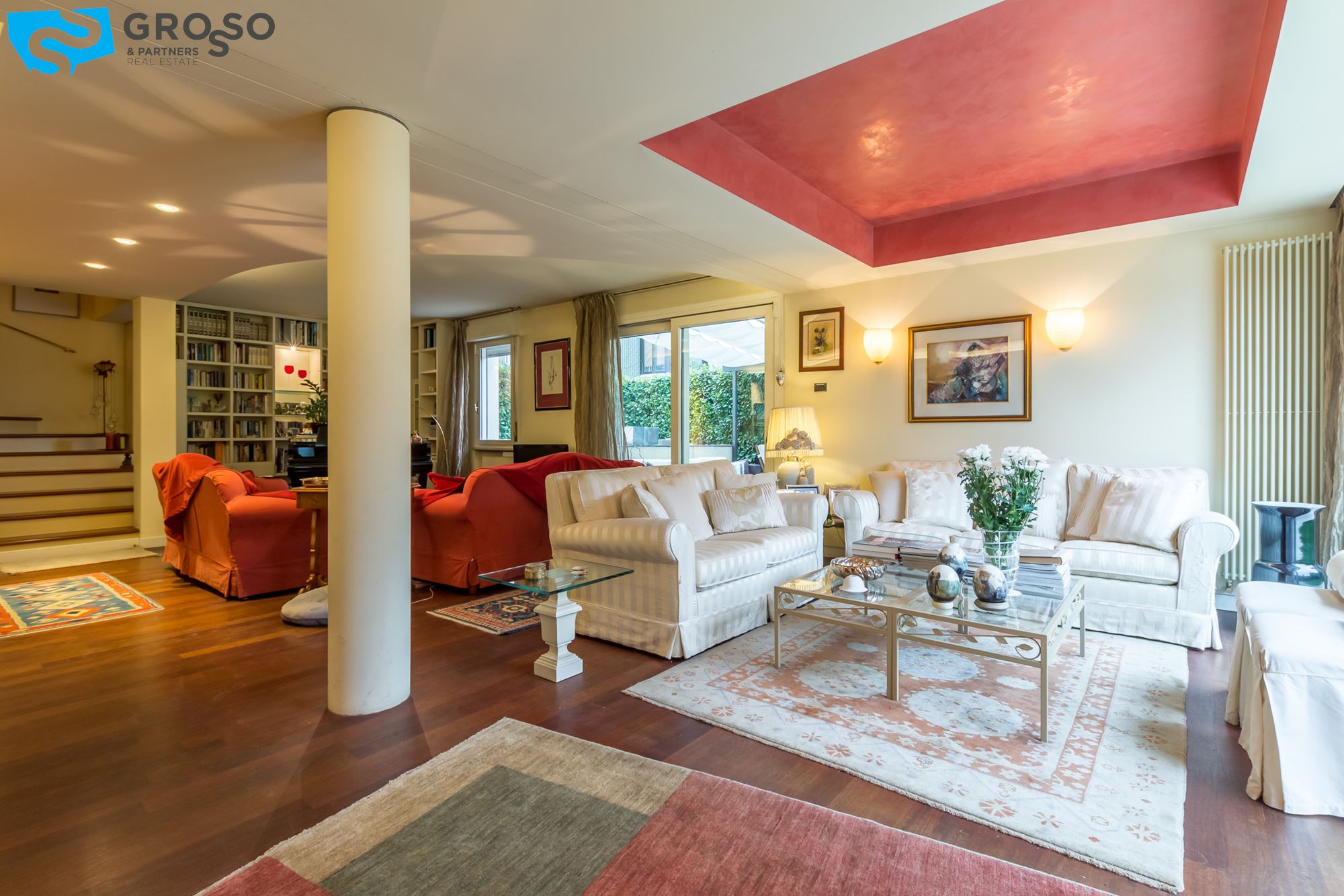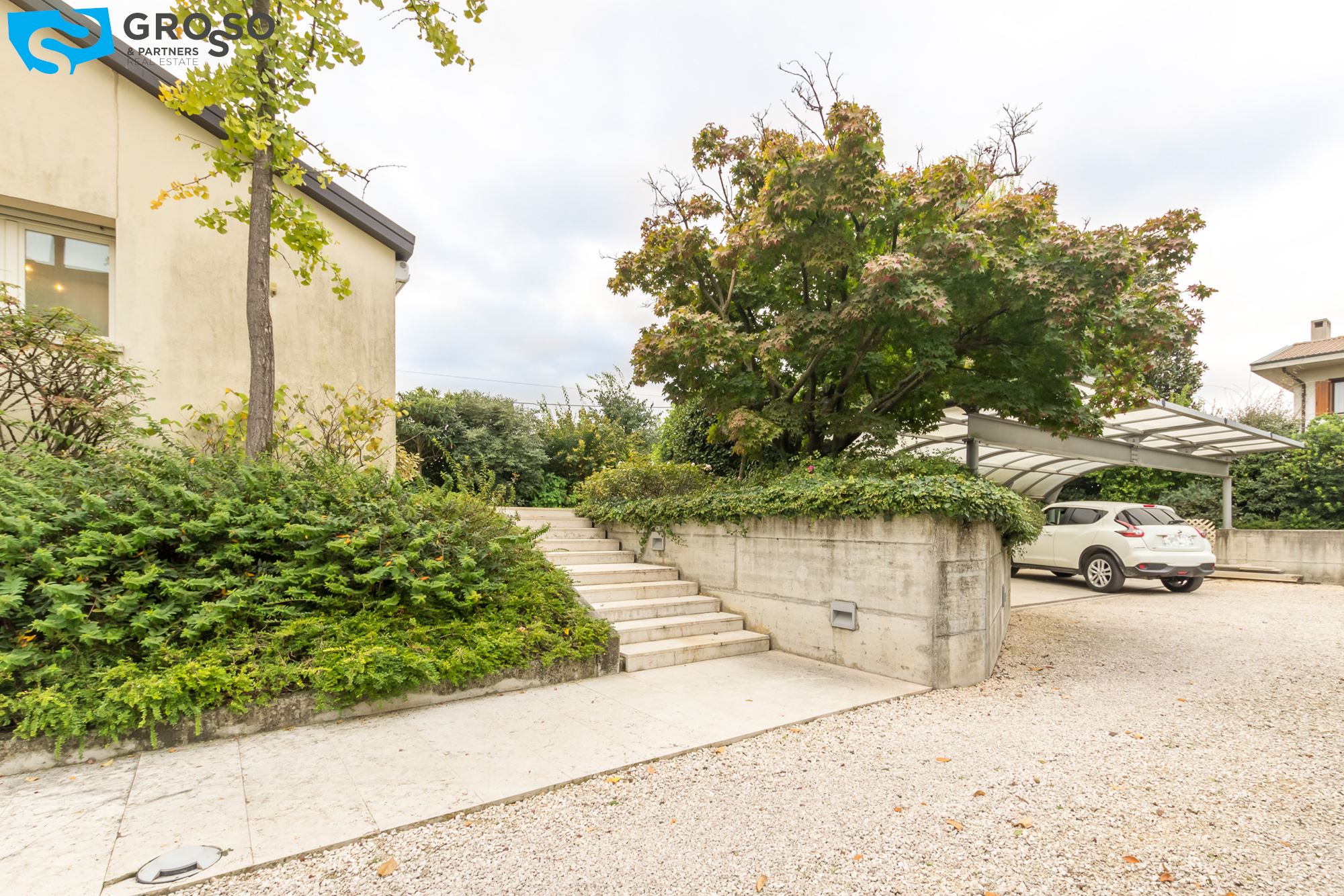 Strepitoso giardino piantumato, dal salotto si accede con un ampia vetrata scorrevole ad un plateatico coperto per le cene estive.