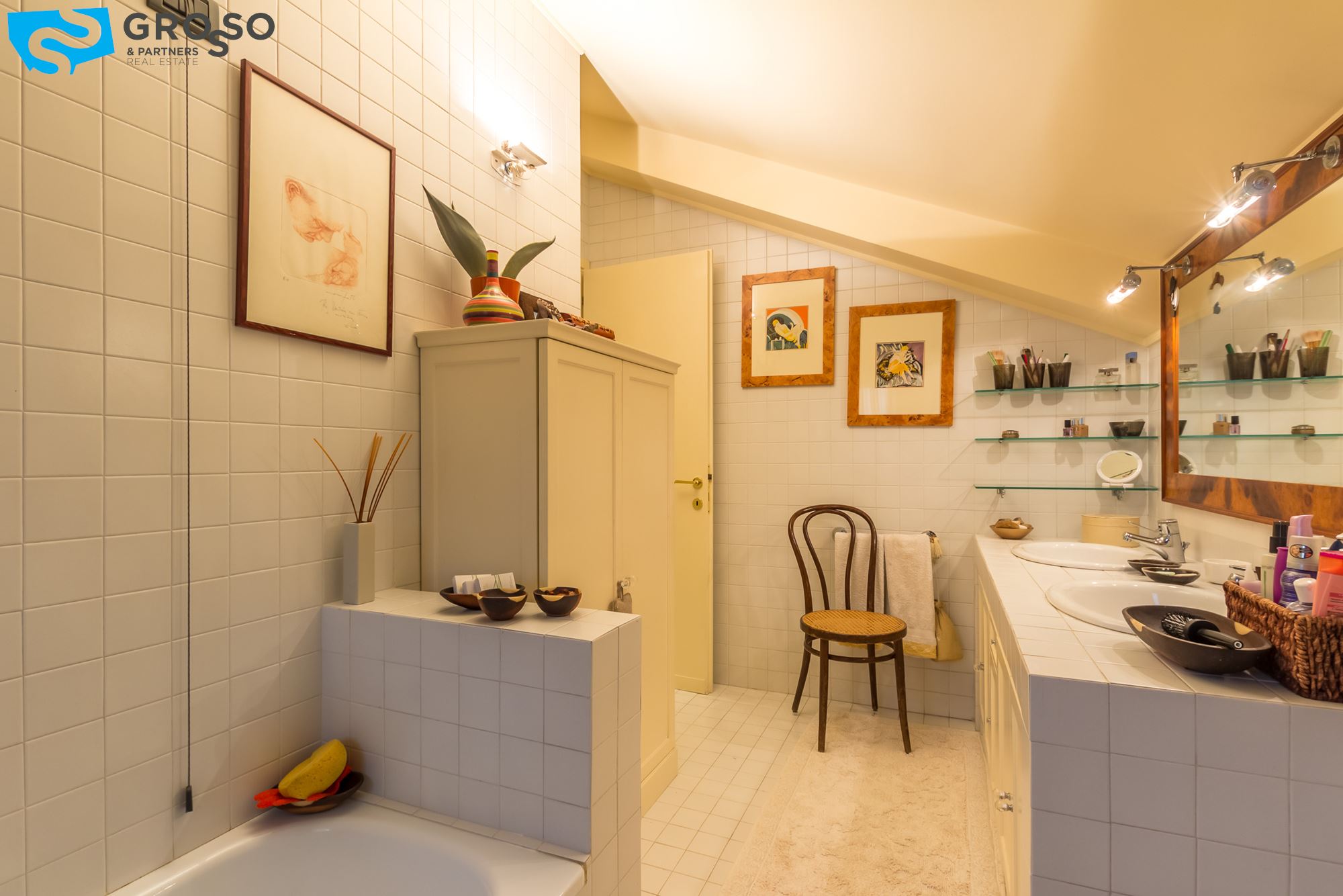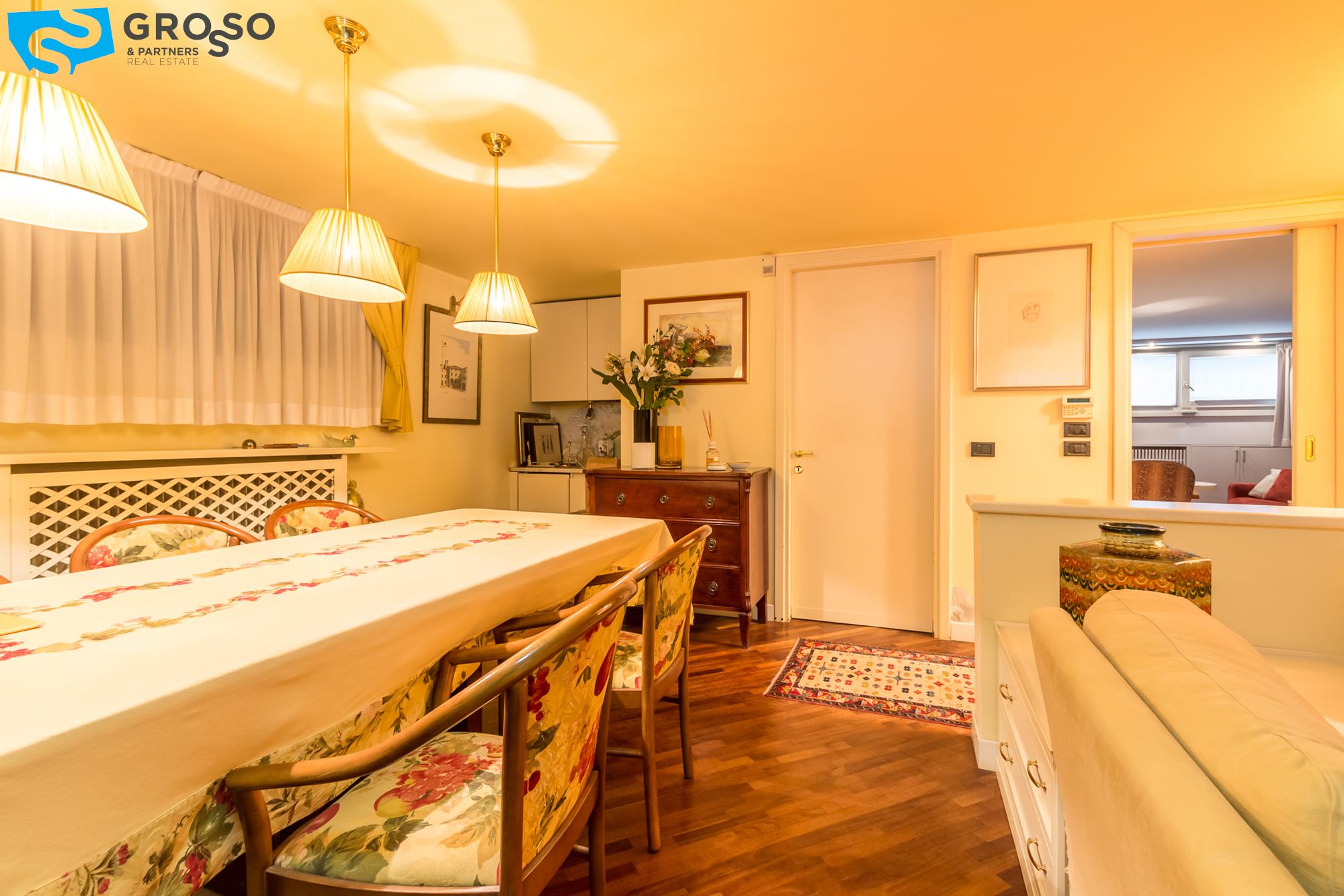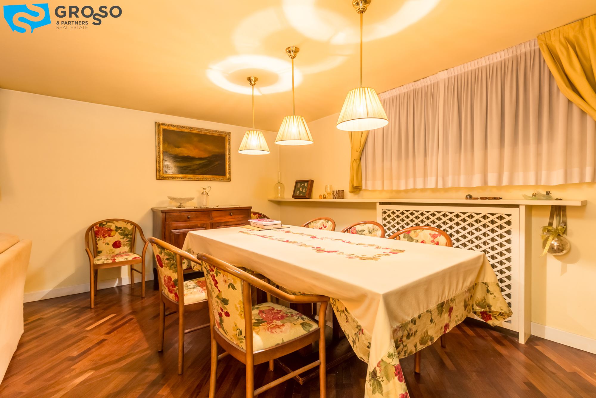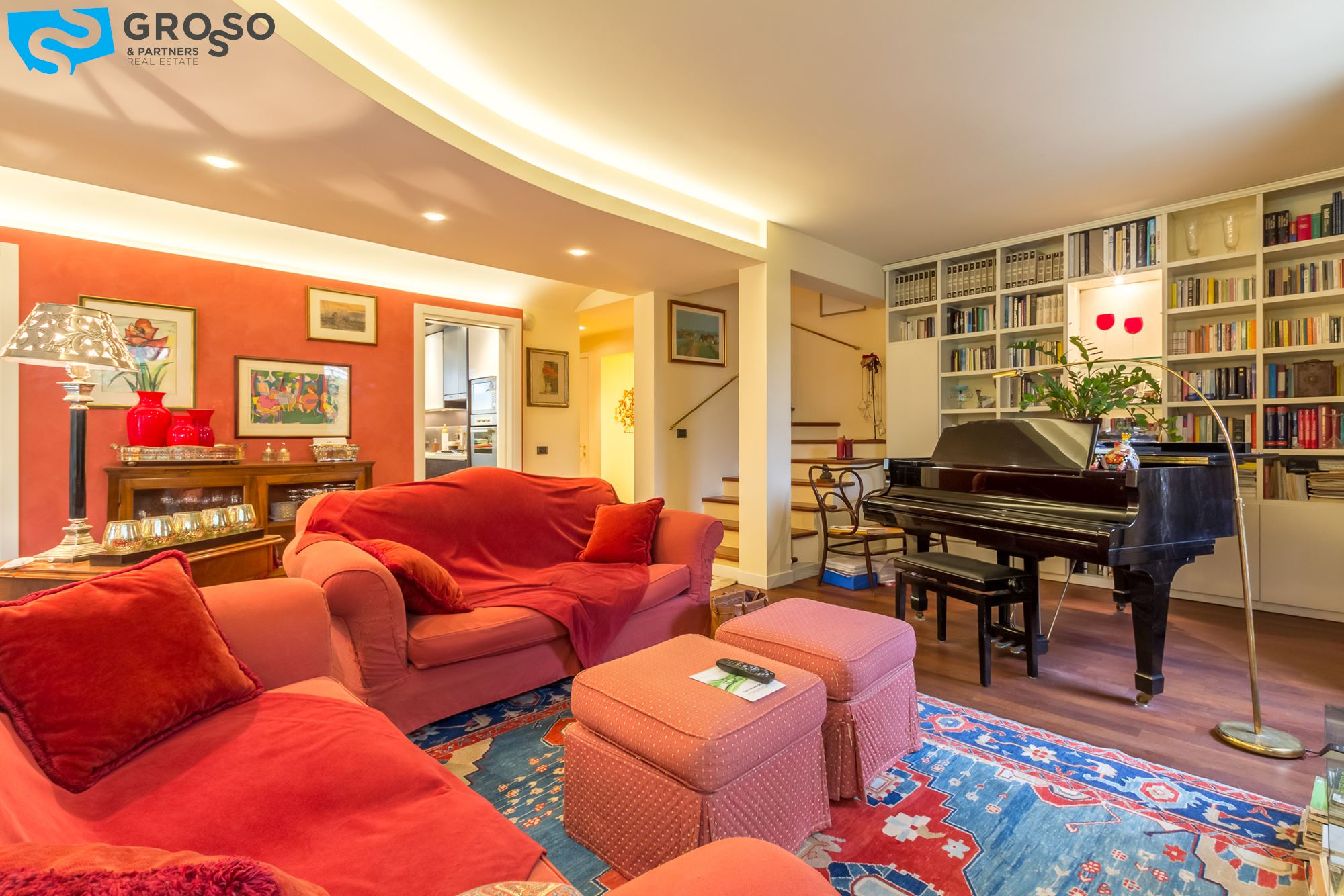 Strepitoso giardino piantumato, dal salotto si accede con un ampia vetrata scorrevole ad un plateatico coperto per le cene estive.