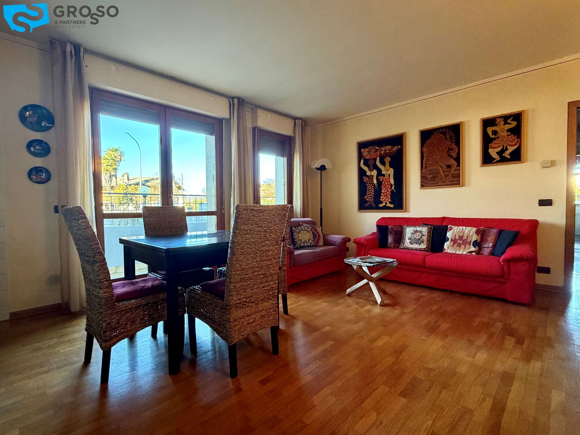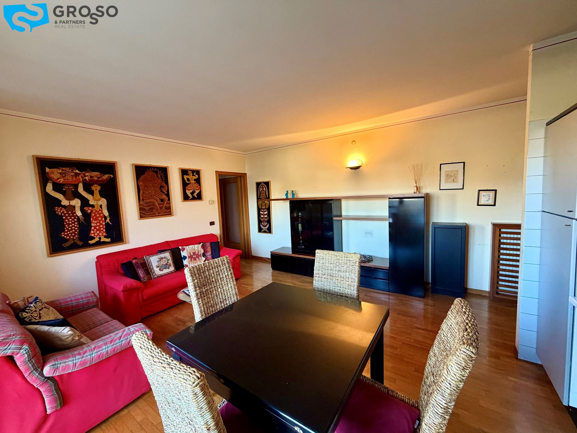 L'immobile si presenta in buone condizioni ed è così composto: ingresso su zona giorno open space con soggiorno, pranzo e cucina a vista, dalla quale si accede alla terrazza che circonda l'intero appartamento, ideale per momenti di relax all'aperto o per pranzi estivi.
