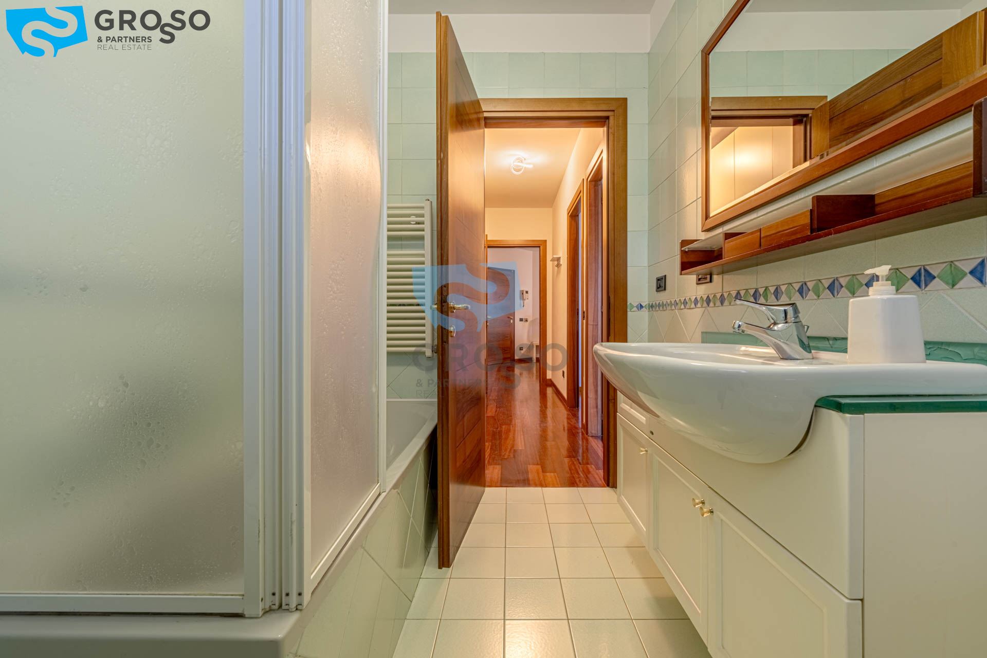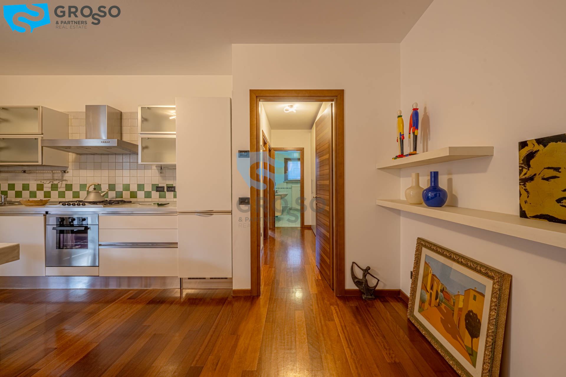 La zona notte offre un ampio disimpegno con armadio a muro e spazio per lavatrice e asciugatrice, una camera singola/studio, una camera matrimoniale e un bagno finestrato.