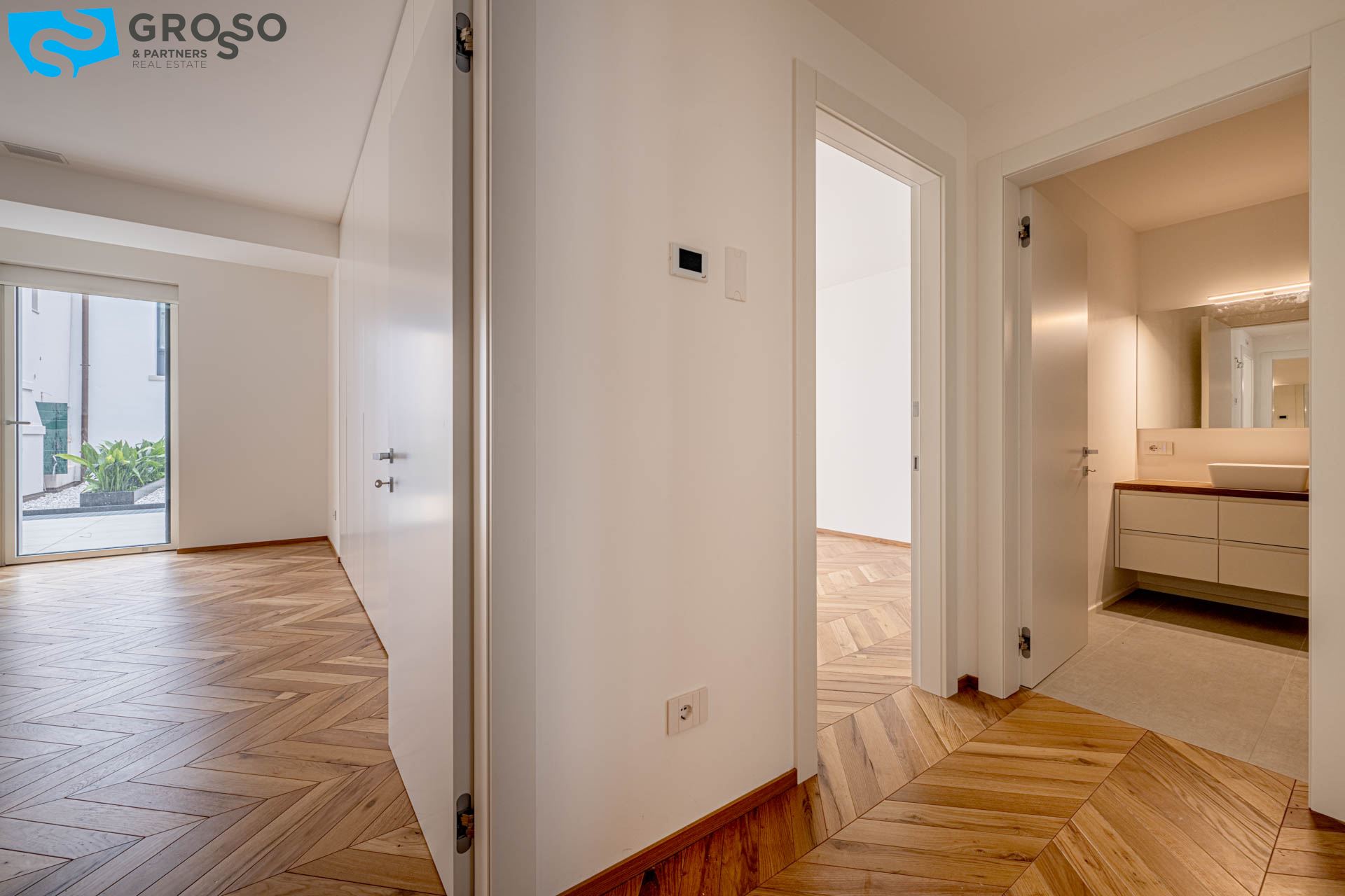 L'appartamento è situato al piano primo, presenta una spaziosa zona giorno con cucina e soggiorno, due camere di cui una matrimoniale e una singola e due bagni completi. L'architettura è pensata per permettere alla luce naturale di avvolgere ogni ambiente, creando un'atmosfera accogliente.