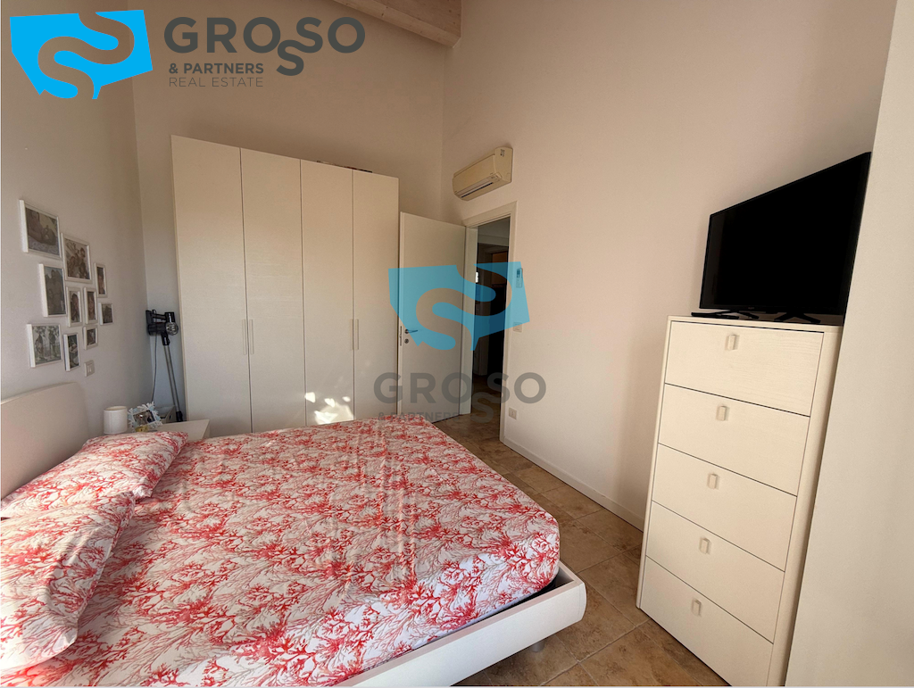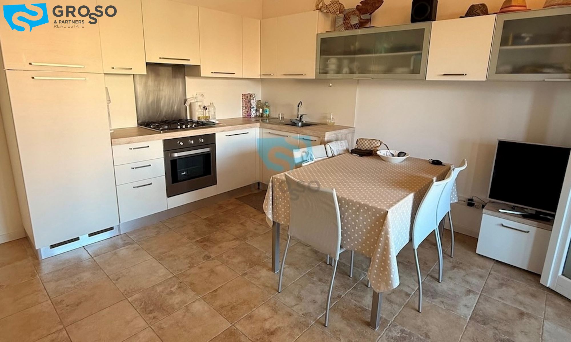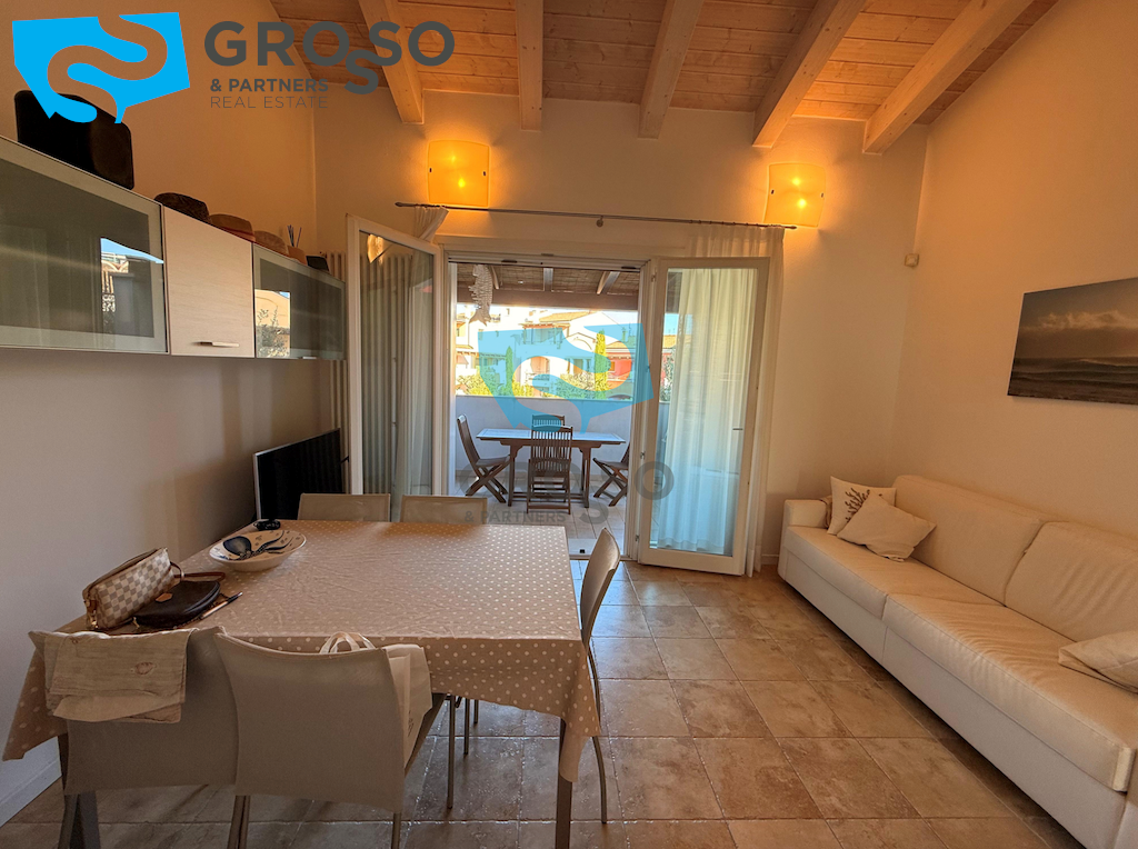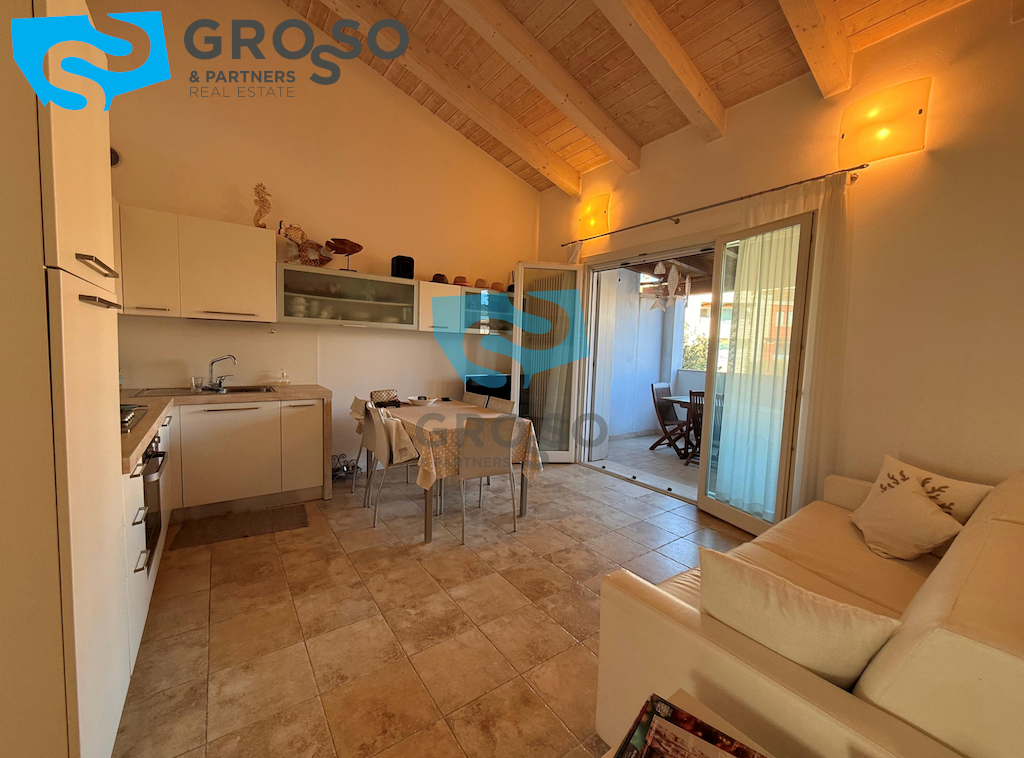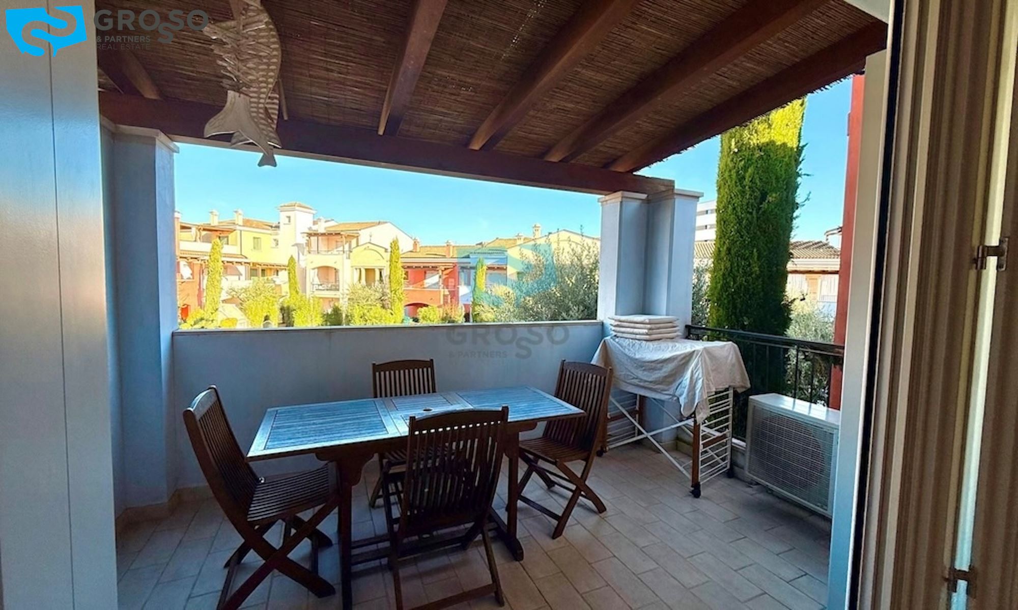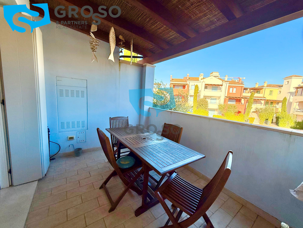 L' immobile è composto da un ampio soggiorno con angolo cottura, perfettamente integrato nella zona living e con accesso diretto alla terrazza coperta, spazio ideale per pranzi e cene all'aperto con affaccio sulla splendida piscina condominiale. La zona notte comprende una camera matrimoniale, una cameretta e un bagno finestrato dotato di tutti i comfort.