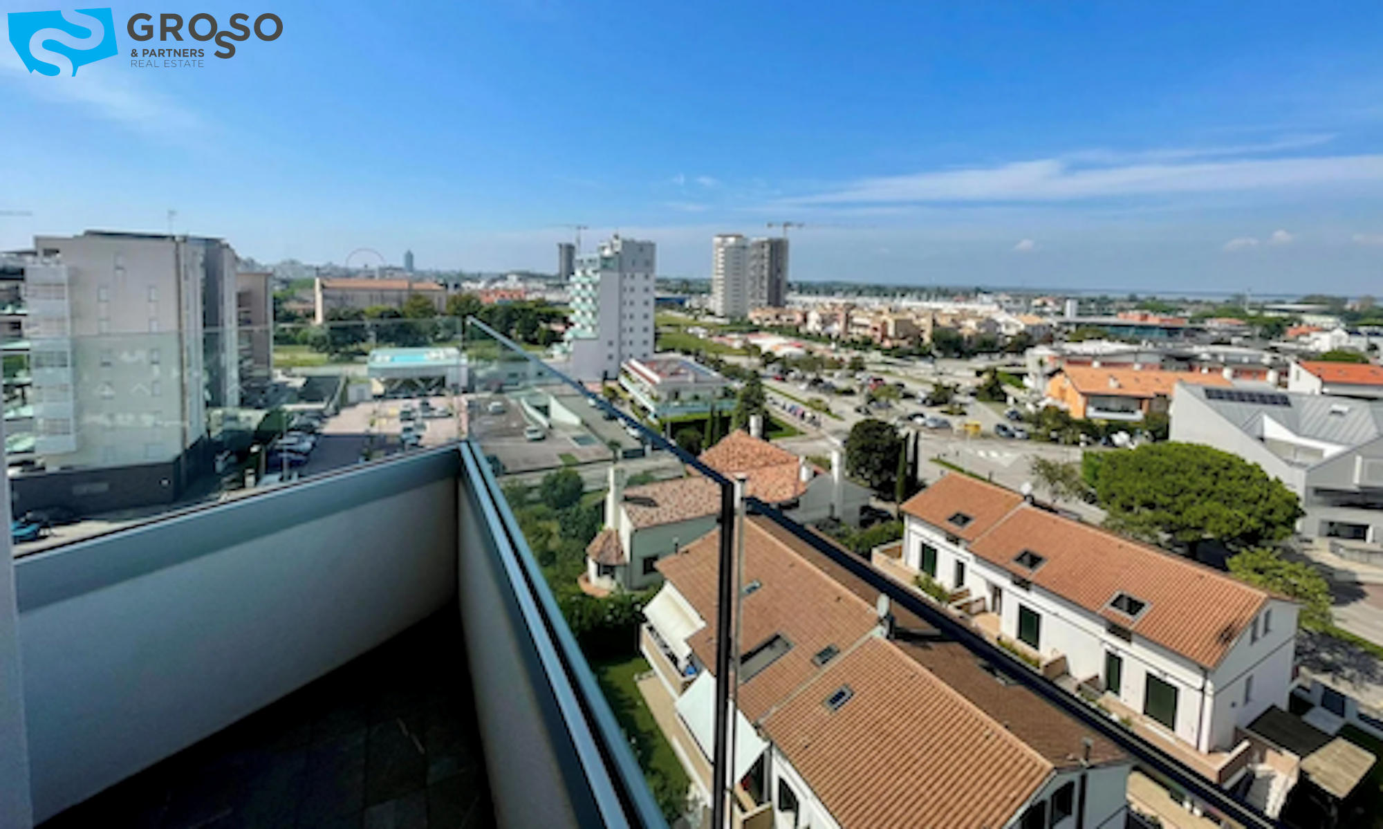 Al settimo piano del prestigioso complesso UP TOWN, a soli 300 m dalla spiaggia e a pochi passi da Piazza Drago, proponiamo moderno appartamento in palazzina di sole nove unità. L' edificio, sviluppato su dieci piani, rappresenta un nuovo riferimento nel cuore di Lido di Jesolo grazie al design contemporaneo e ai grandi terrazzi, vero tratto distintivo delle residenze. L' appartamento offre un luminoso soggiorno con angolo cottura e ampie vetrate che si affacciano sul terrazzo abitabile. La zona notte comprende due camere matrimoniali, di cui una con bagno privato dotato di box doccia, oltre a un secondo bagno finestrato, anch'esso con box doccia. Sono presenti inoltre due terrazze, entrambe ideali per ammirare una meravigliosa vista panoramica su Jesolo. Completano la proprietà un comodo posto auto coperto da pompeiana, riscaldamento autonomo a pavimento e raffrescamento canalizzato. Una soluzione esclusiva, moderna e confortevole, ideale per vivere Jesolo tutto l'anno o come elegante casa vacanze.