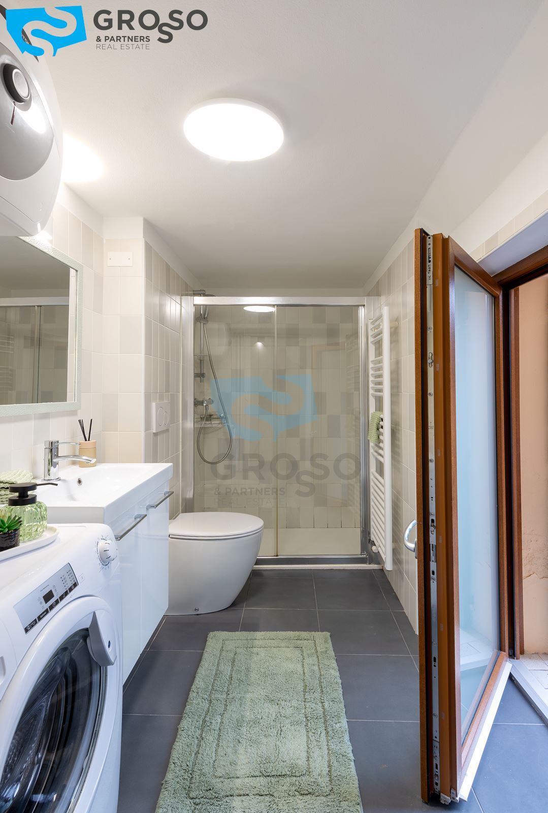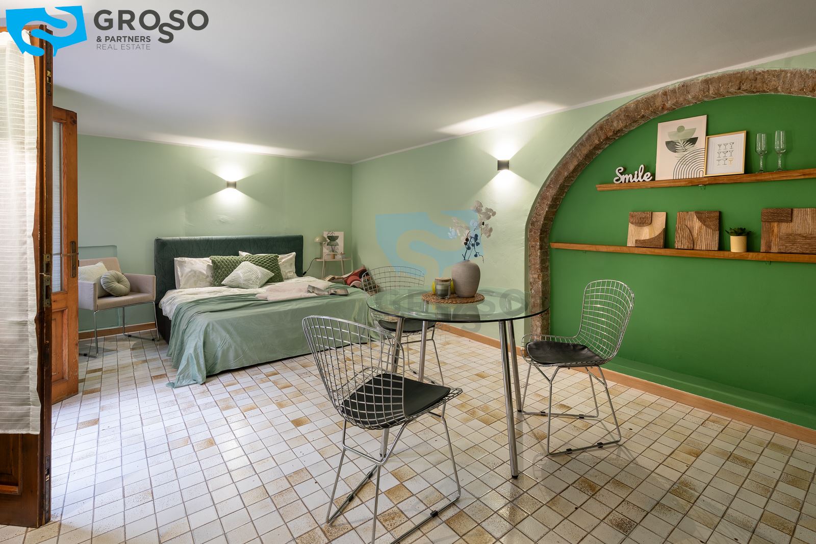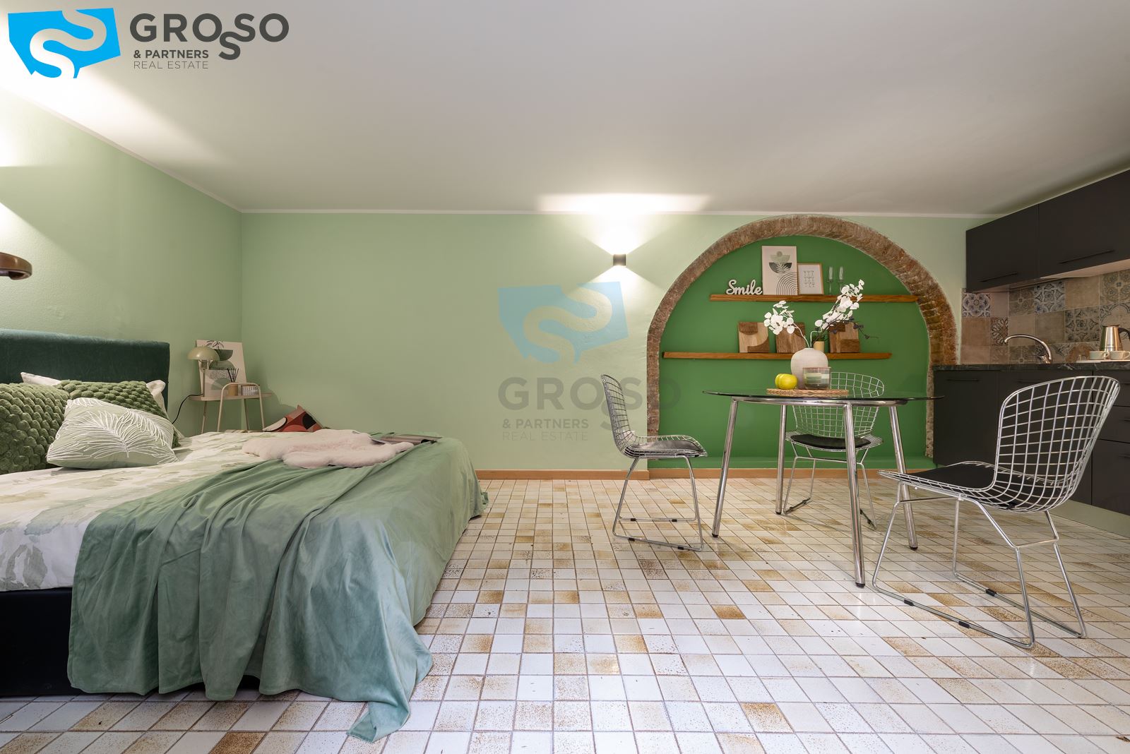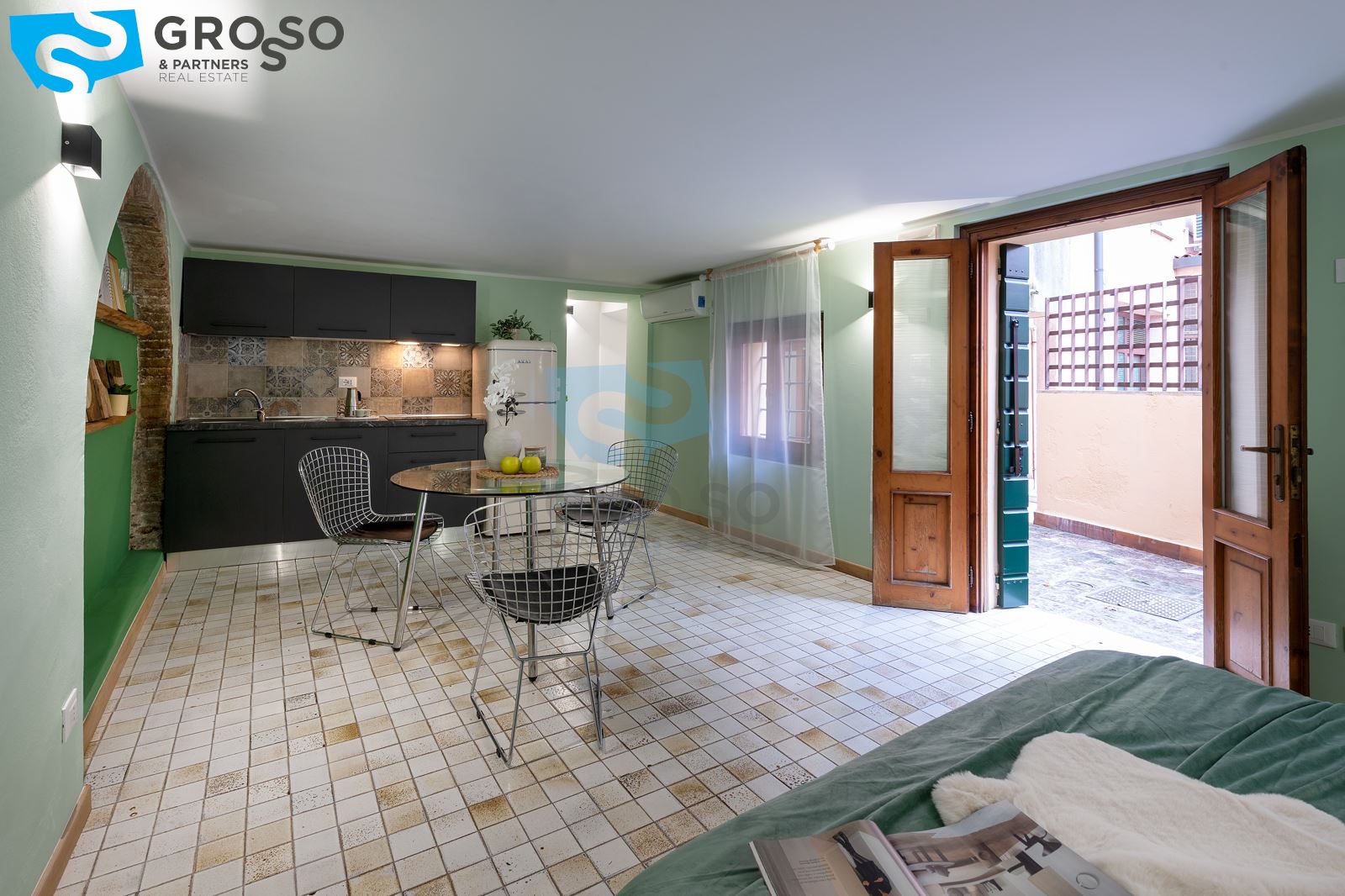 L'immobile è composto da un luminoso soggiorno con zona pranzo e cucina a vista, camera matrimoniale e bagno con doccia. L'appartamento è dotato di riscaldamento autonomo a radiatori e aria condizionata con split.