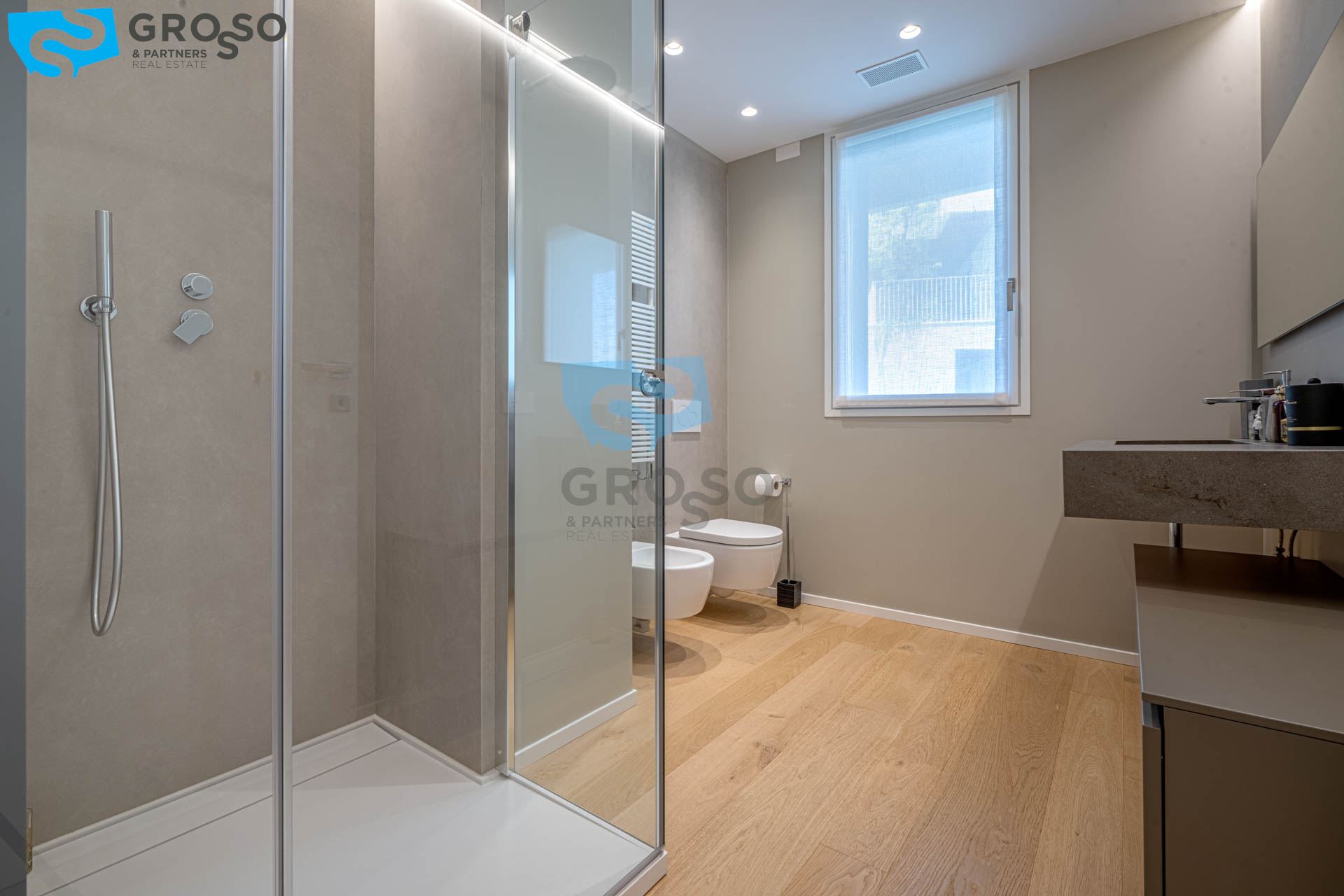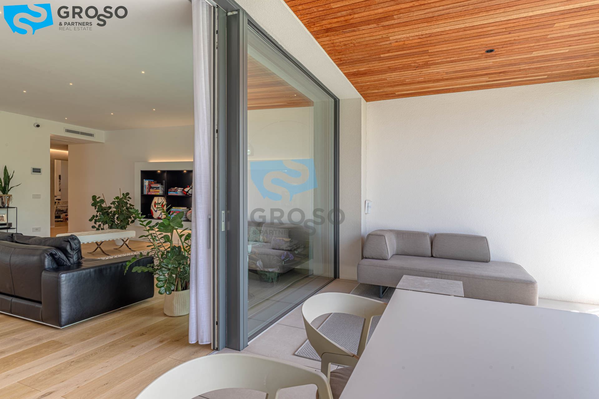 La grande terrazza di 48 mq si affaccia sul verde rigoglioso del fiume e della Restera, regalando ogni giorno un quadro diverso, tra riflessi d'acqua e silenzi rigeneranti. La zona notte si compone di una suite matrimoniale, una camera doppia, una singola, due bagni e una comoda lavanderia. Ogni spazio è stato studiato per offrire bellezza e funzionalità, senza compromessi.