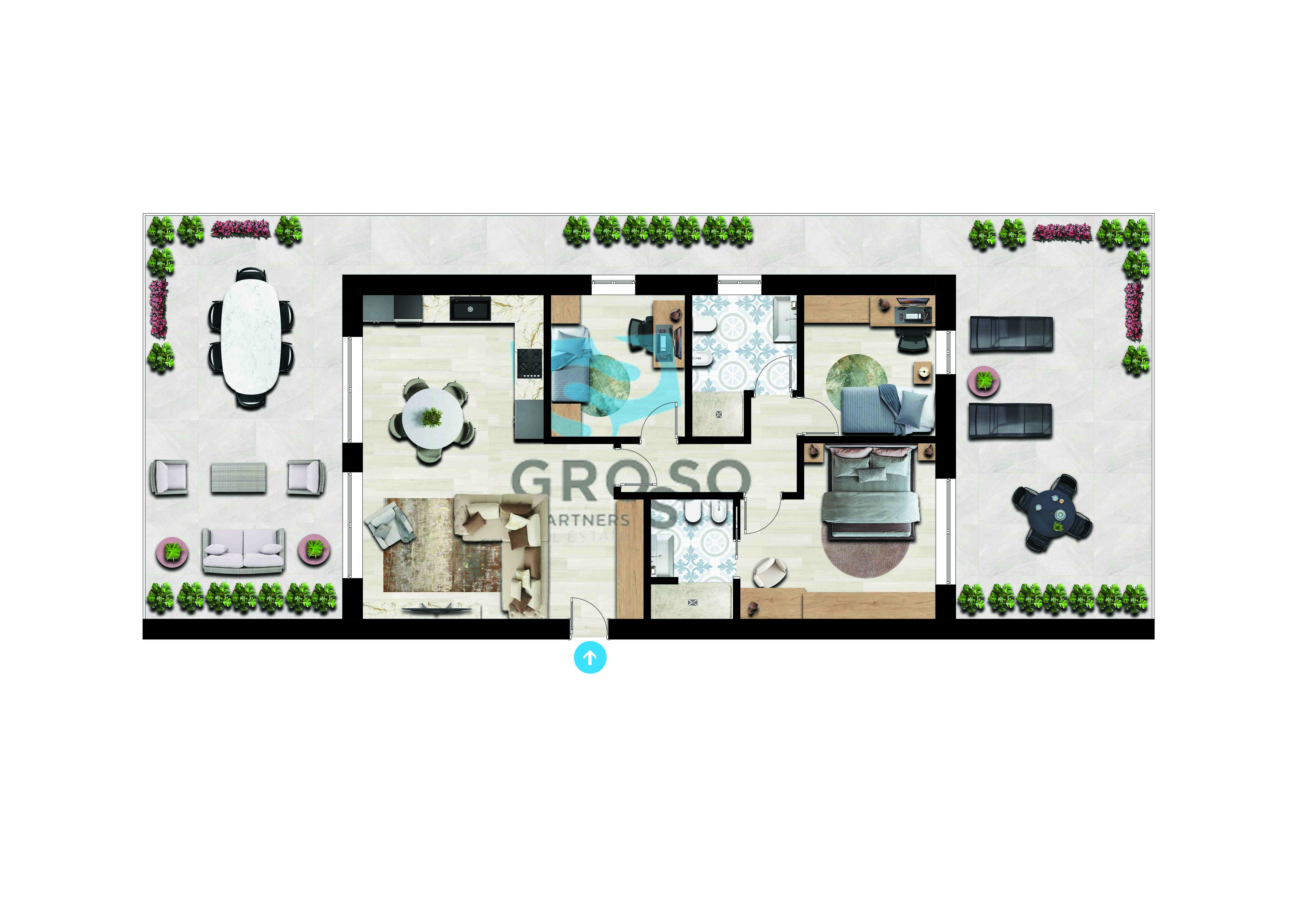 L'appartamento è sito al piano primo, si apre in una luminosa zona giorno-cottura open space di oltre 36 mq, due bagni completi, una camera matrimoniale e due camere singole. Completa la proprietà un terrazzo abitabile di 66 mq libero su tre lati.
