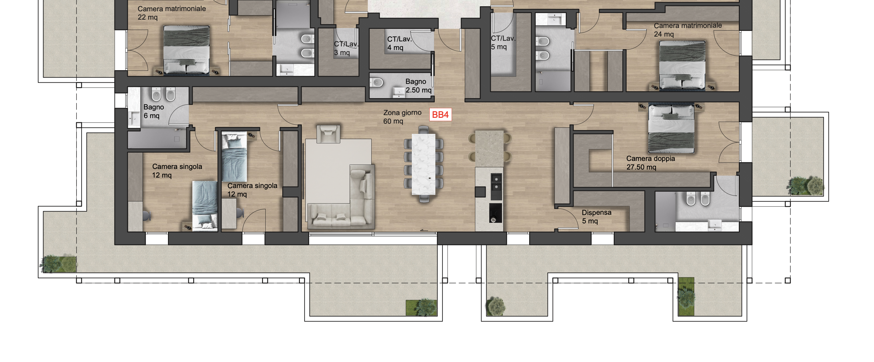 Nel cuore di Treviso, tra Via Monterumici e Viale Montegrappa, nasce MONTEGRAPPA 27, un progetto residenziale che reinventa il modo di vivere in città, unendo design contemporaneo, natura e comfort quotidiano. Gli edifici ospitano le residenze Amaranth e Belle, rispettivamente di 18 e 16 unità, progettate per offrire privacy, luce naturale e spazi funzionali. Linee eleganti, volumi armonici e dettagli raffinati creano ambienti in equilibrio tra estetica e praticità. Protagoniste del progetto sono le ampie terrazze, concepite come estensioni degli ambienti interni grazie alle grandi vetrate. Spazi da vivere ogni giorno, dove il verde diventa parte integrante di uno stile di vita autentico e sostenibile. Gli interni, luminosi e ben distribuiti, offrono un perfetto equilibrio tra estetica e funzionalità. Questo appartamento è composto da un soggiorno con angolo cottura, una camera matrimoniale con bagno privato, due camere singole, un bagno di servizio con lavanderia e infine una dispensa. Sia dal soggiorno sia dalle camere si accede direttamente alle terrazze, creando un collegamento fluido tra interno ed esterno e valorizzando la luce naturale in tutti gli ambienti.