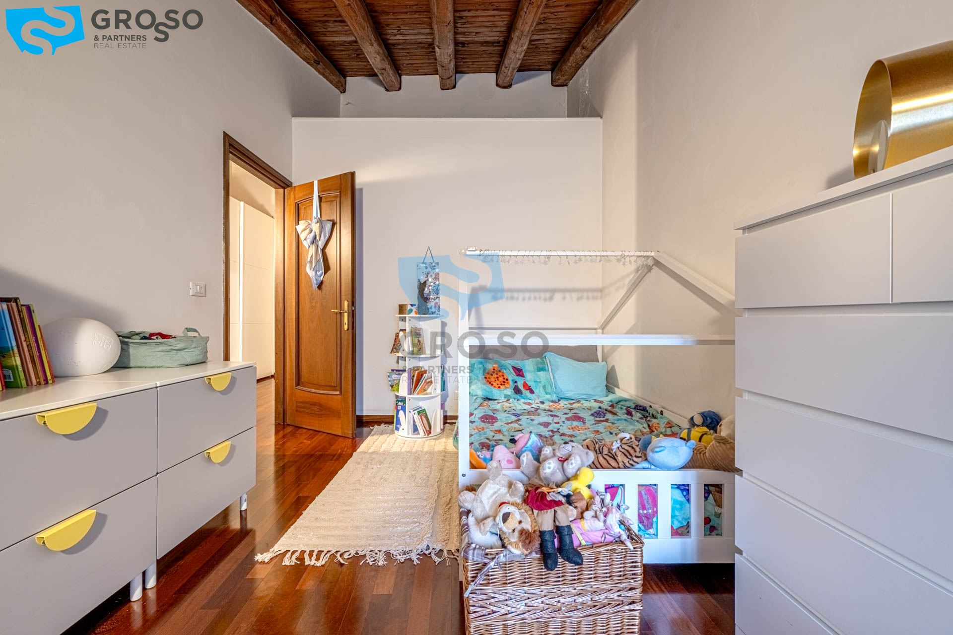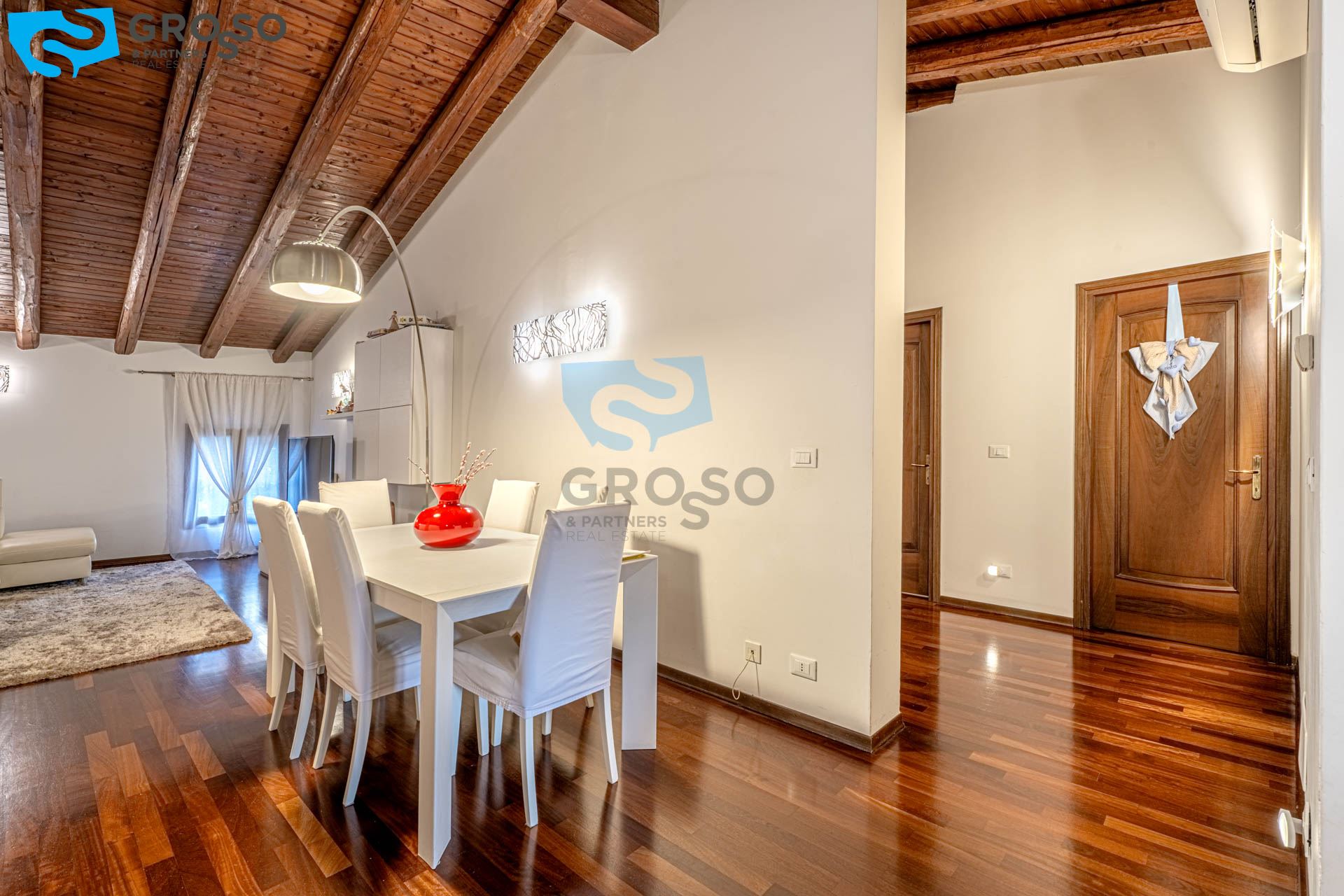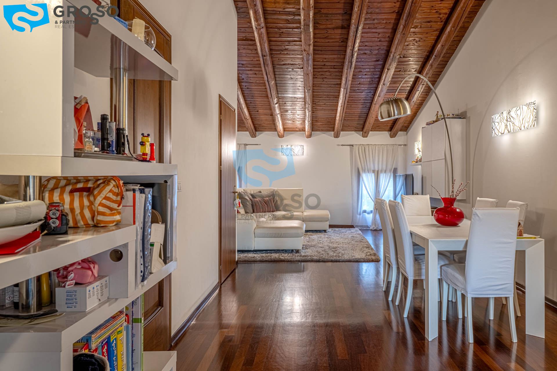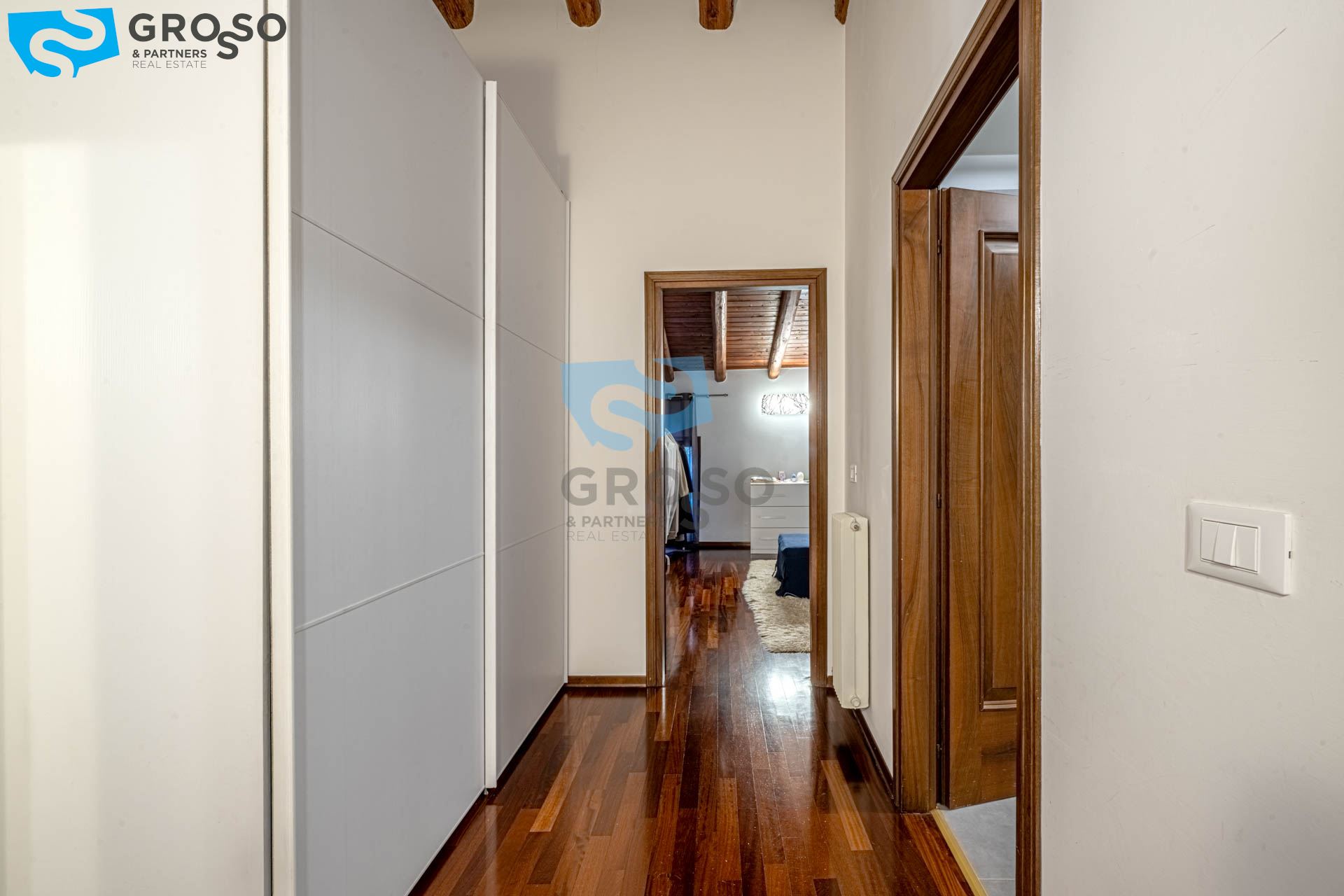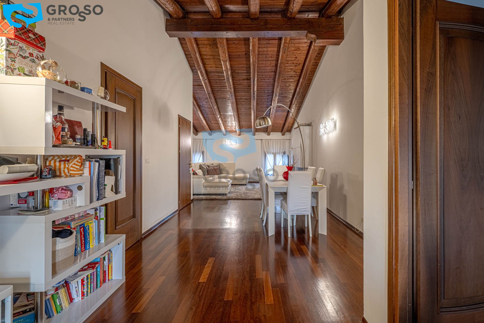 L'appartamento è caratterizzato da un forte fascino grazie alle travature in legno a vista, che donano calore e personalità agli ambienti, richiamando lo stile tipico delle abitazioni del centro storico. La pavimentazione è realizzata in legno in quasi tutta la casa, contribuendo a creare un'atmosfera elegante e accogliente, con l'eccezione dei bagni e della cucina, dove sono stati scelti materiali più pratici e funzionali.