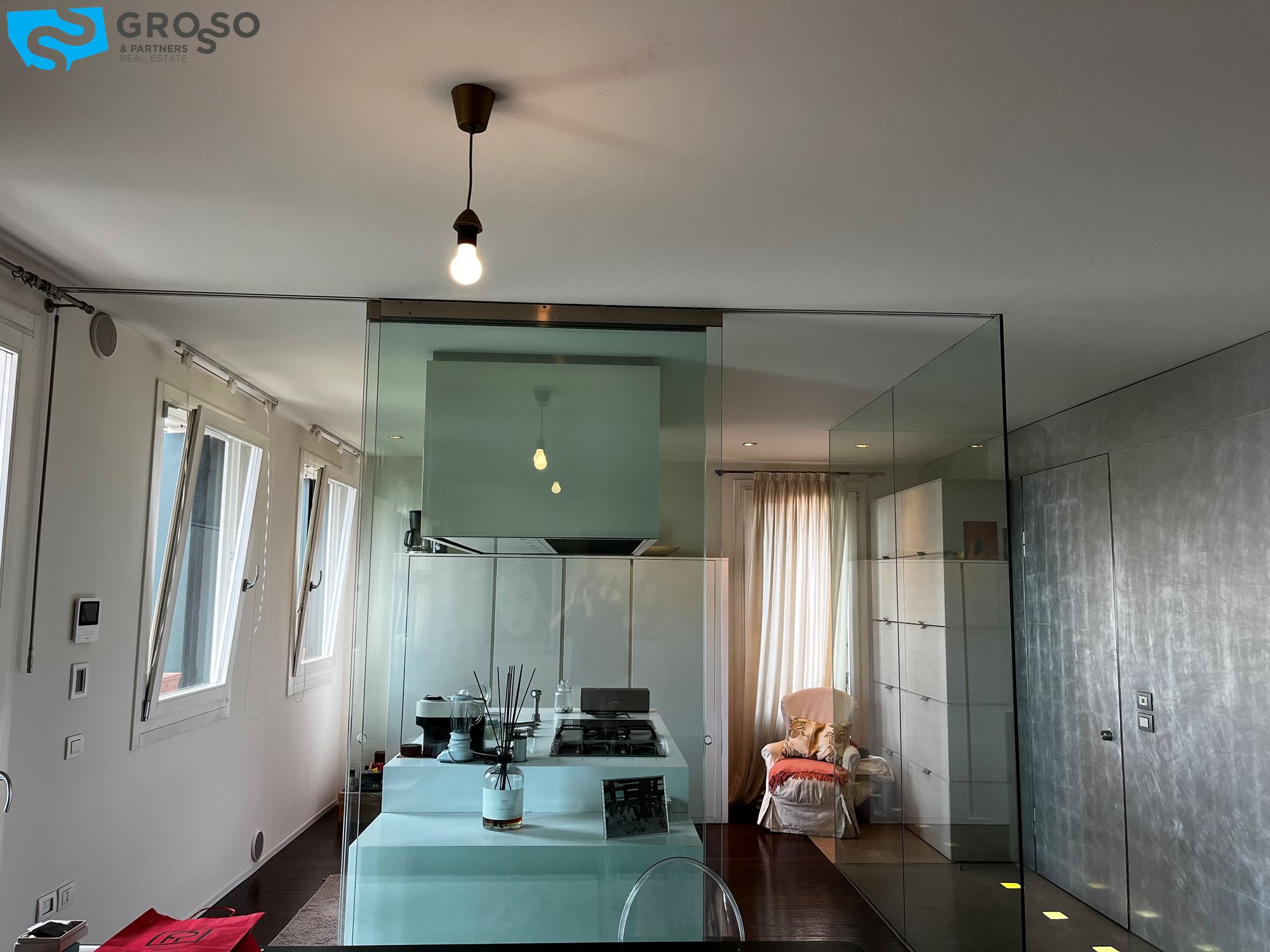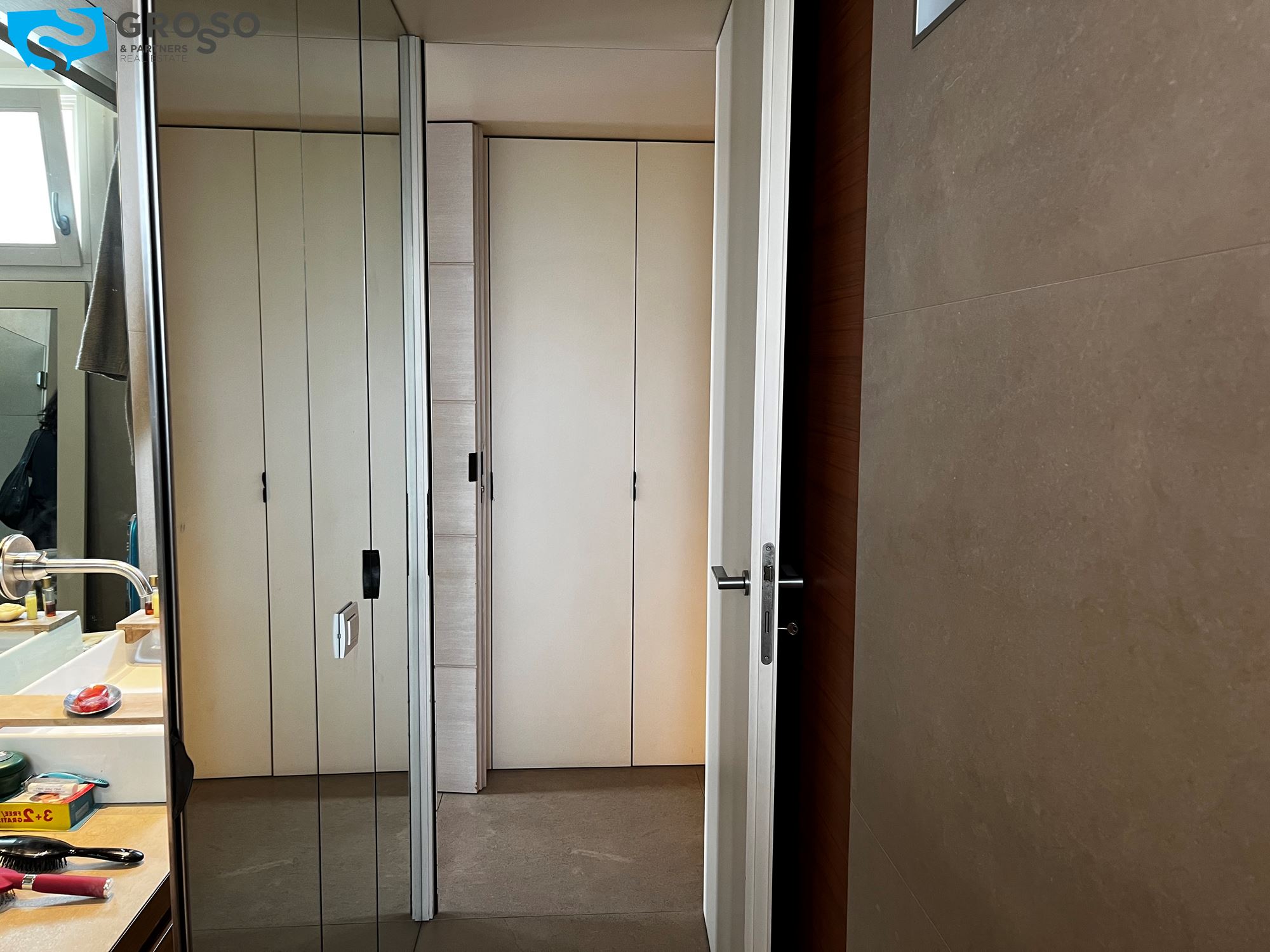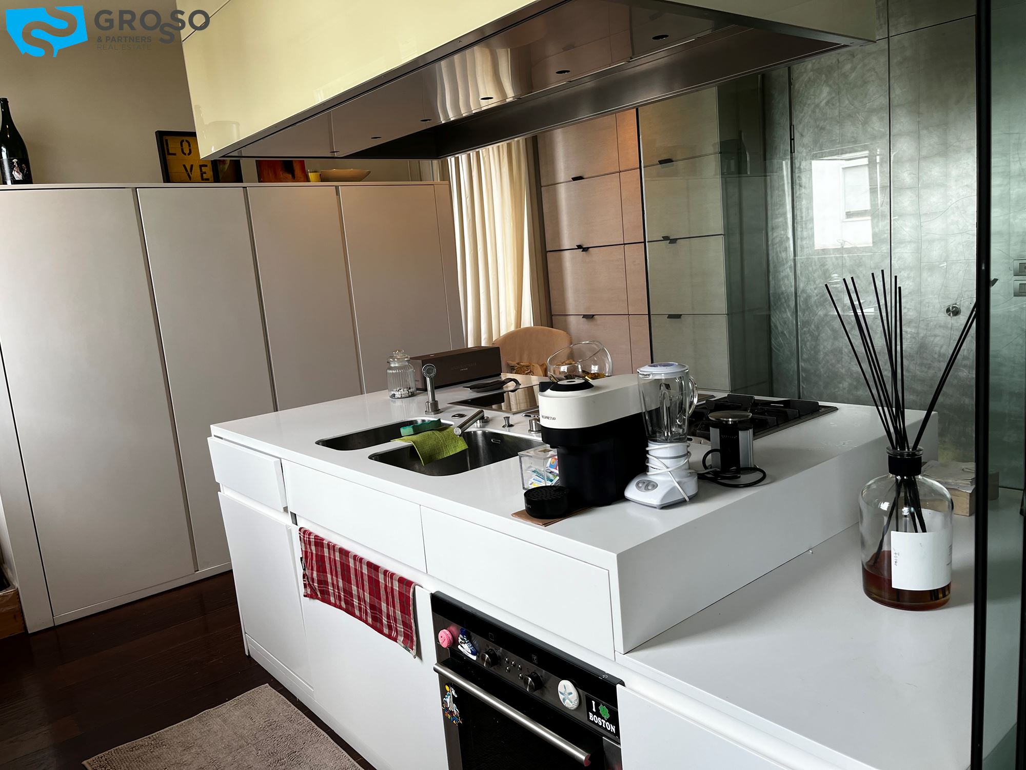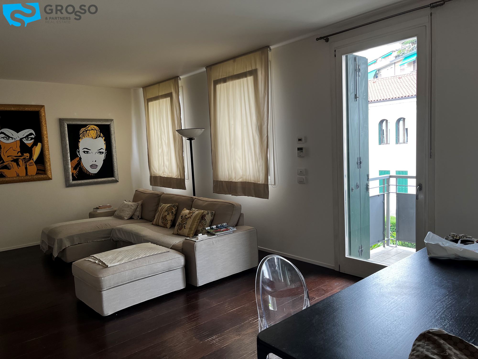 Treviso, in Via Montello, immediato fuori mura a due passi dalle mura cittadine, disponiamo di bellissimo appartamento arredato in stile moderno e dotato di tutti i confort. L'immobile, sito al primo piano dotato di ascensore, è composto da: scenografico ingresso con parete decorata in foglia d'argento, cucina a vista con isola centrale, zona pranzo e soggiorno con parete completamente armadiata e ampie porte finestre ad illuminare la stanza di luce naturale, che si aprono su due poggioli. In zona notte, l'armadiatura a muro si si sviluppa lungo tutto il disimpegno che porta alle tre camere, di cui una matrimoniale con bagno en suite e due doppie. Completano la zona notte due ulteriori bagni e due poggioli. Al piano interrato troviamo il garage e al piano terra il posto auto scoperto all'interno della corte condominiale. L'immobile viene locato con l'arredo quasi completo (mancheranno tavolo, sedie e divano in zona giorno e letto matrimoniale in zona notte). Riscaldamento autonomo a pavimento, raffrecsamento canalizzato, sistema di allarme.