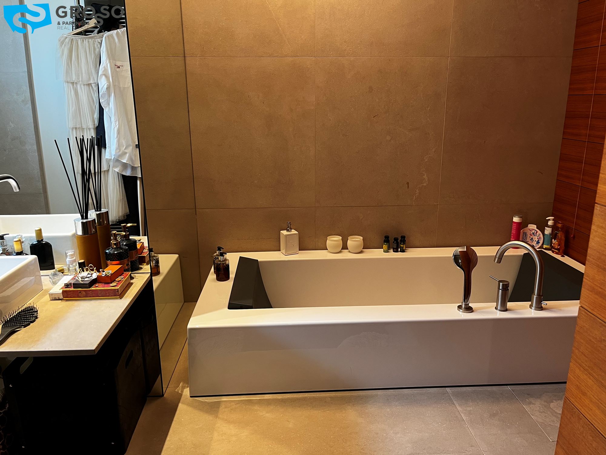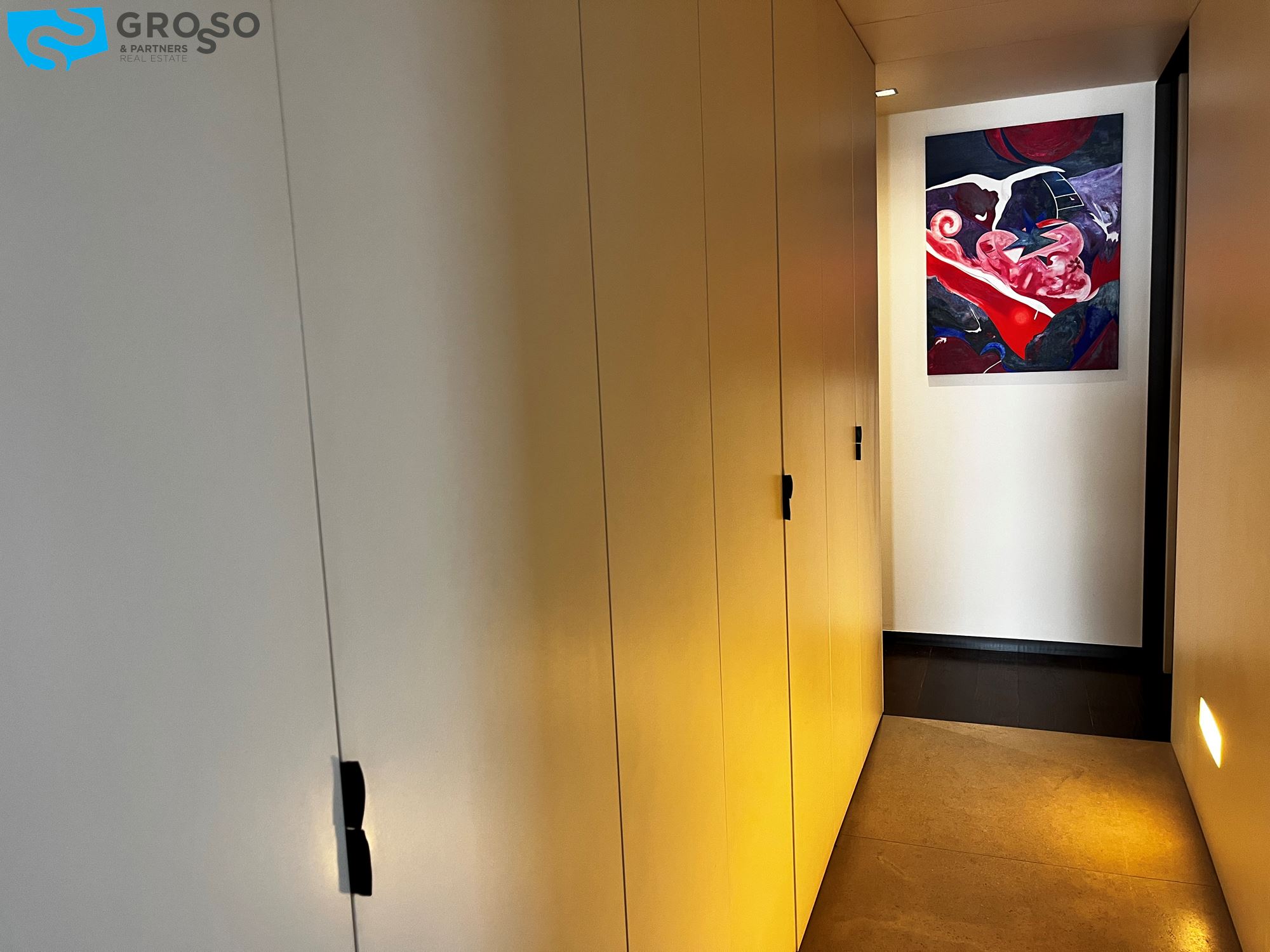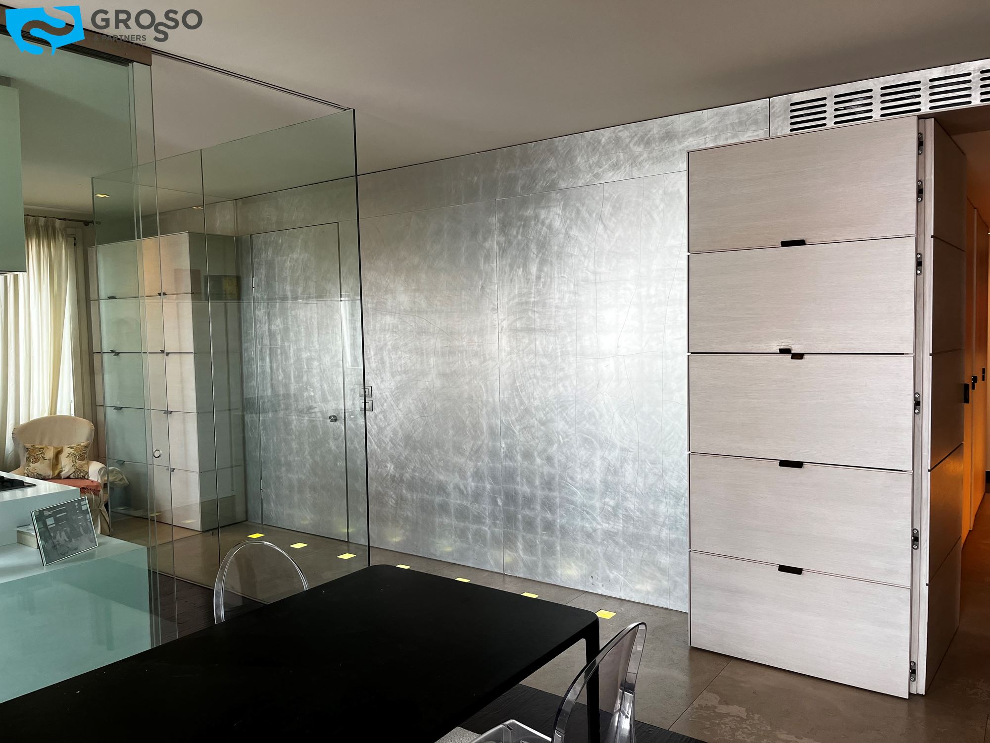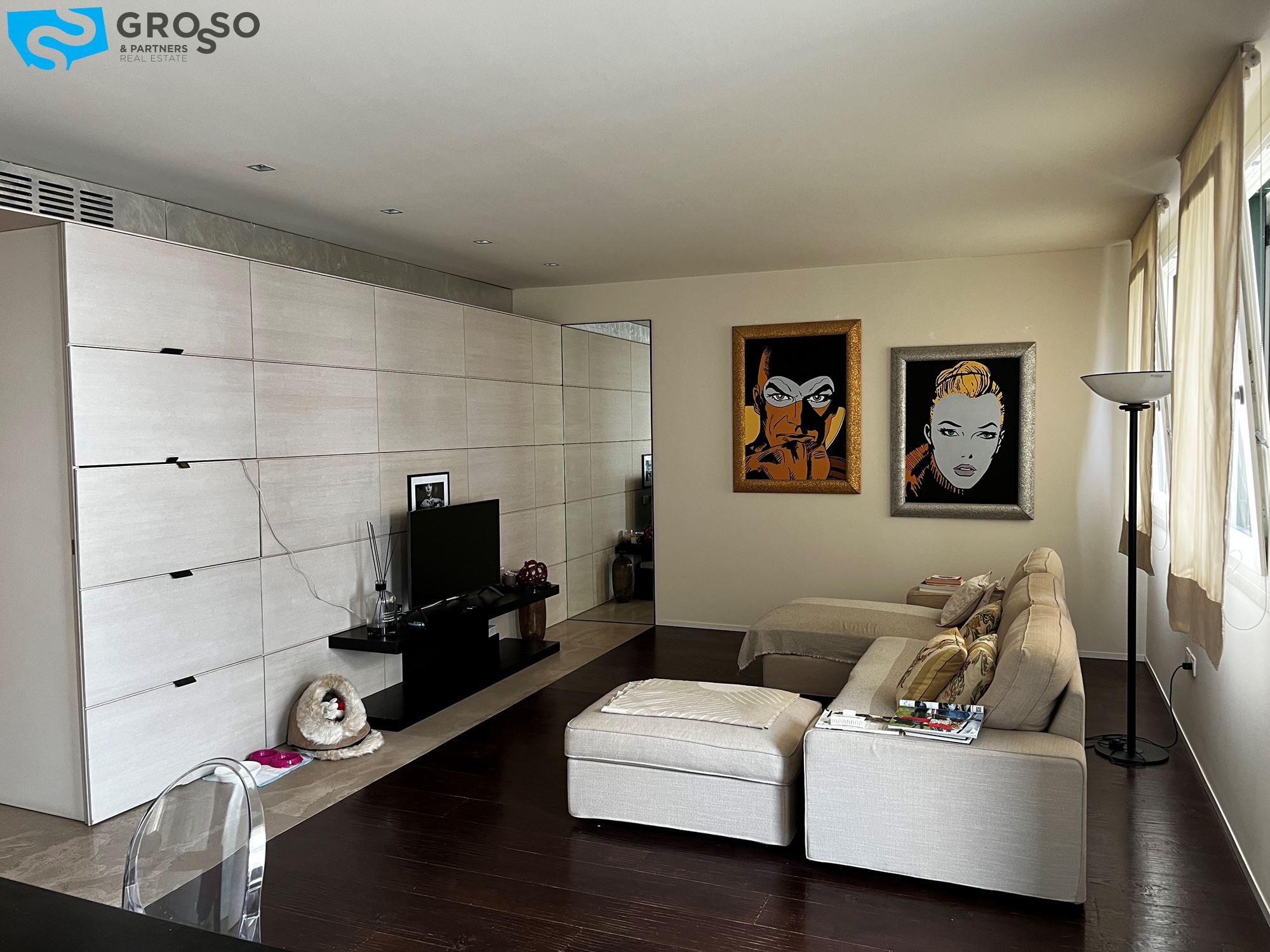 Treviso, in Via Montello, immediato fuori mura a due passi dalle mura cittadine, disponiamo di bellissimo appartamento arredato in stile moderno e dotato di tutti i confort. L'immobile, sito al primo piano dotato di ascensore, è composto da: scenografico ingresso con parete decorata in foglia d'argento, cucina a vista con isola centrale, zona pranzo e soggiorno con parete completamente armadiata e ampie porte finestre ad illuminare la stanza di luce naturale, che si aprono su due poggioli. In zona notte, l'armadiatura a muro si si sviluppa lungo tutto il disimpegno che porta alle tre camere, di cui una matrimoniale con bagno en suite e due doppie. Completano la zona notte due ulteriori bagni e due poggioli. Al piano interrato troviamo il garage e al piano terra il posto auto scoperto all'interno della corte condominiale. L'immobile viene locato con l'arredo quasi completo (mancheranno tavolo, sedie e divano in zona giorno e letto matrimoniale in zona notte). Riscaldamento autonomo a pavimento, raffrecsamento canalizzato, sistema di allarme.