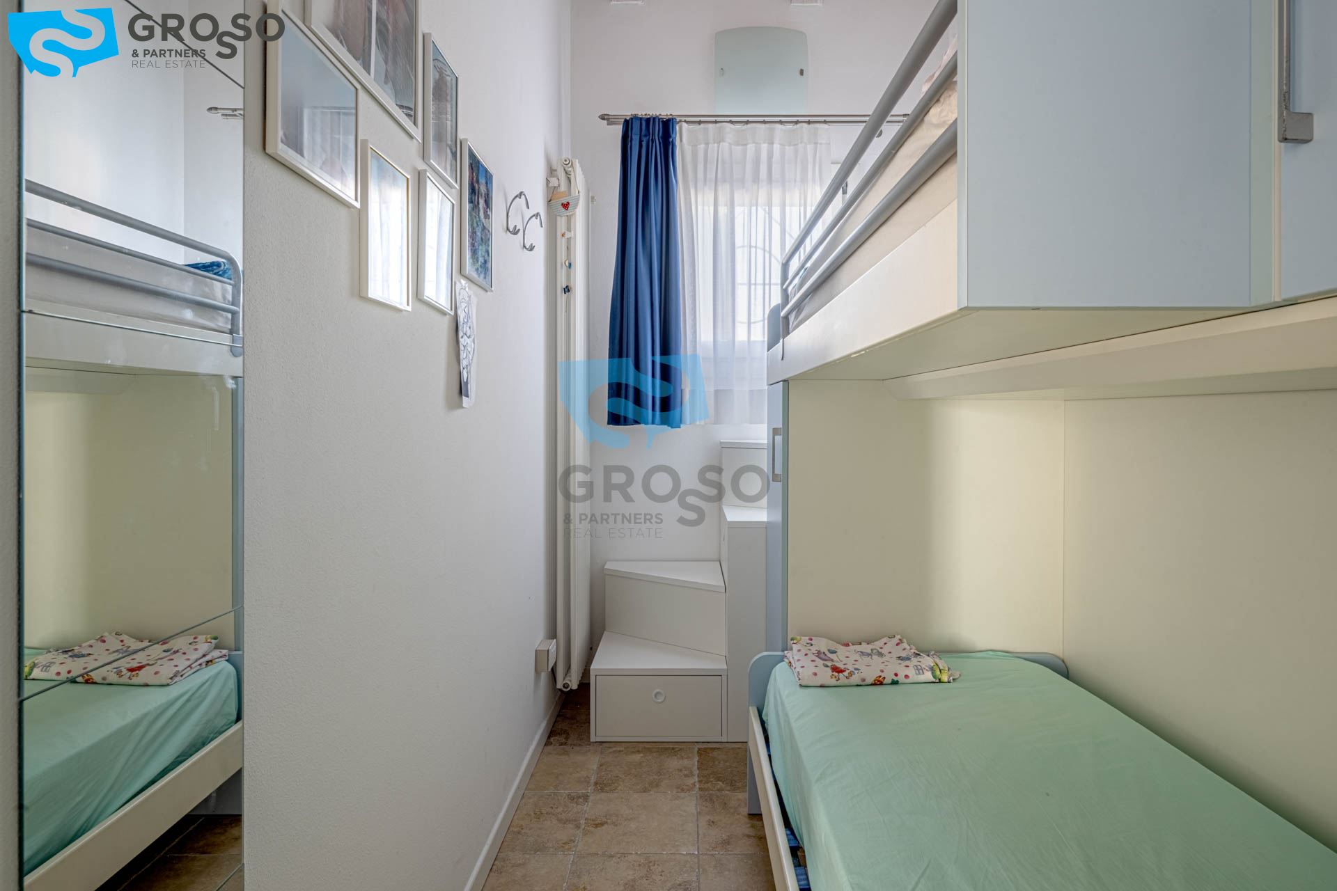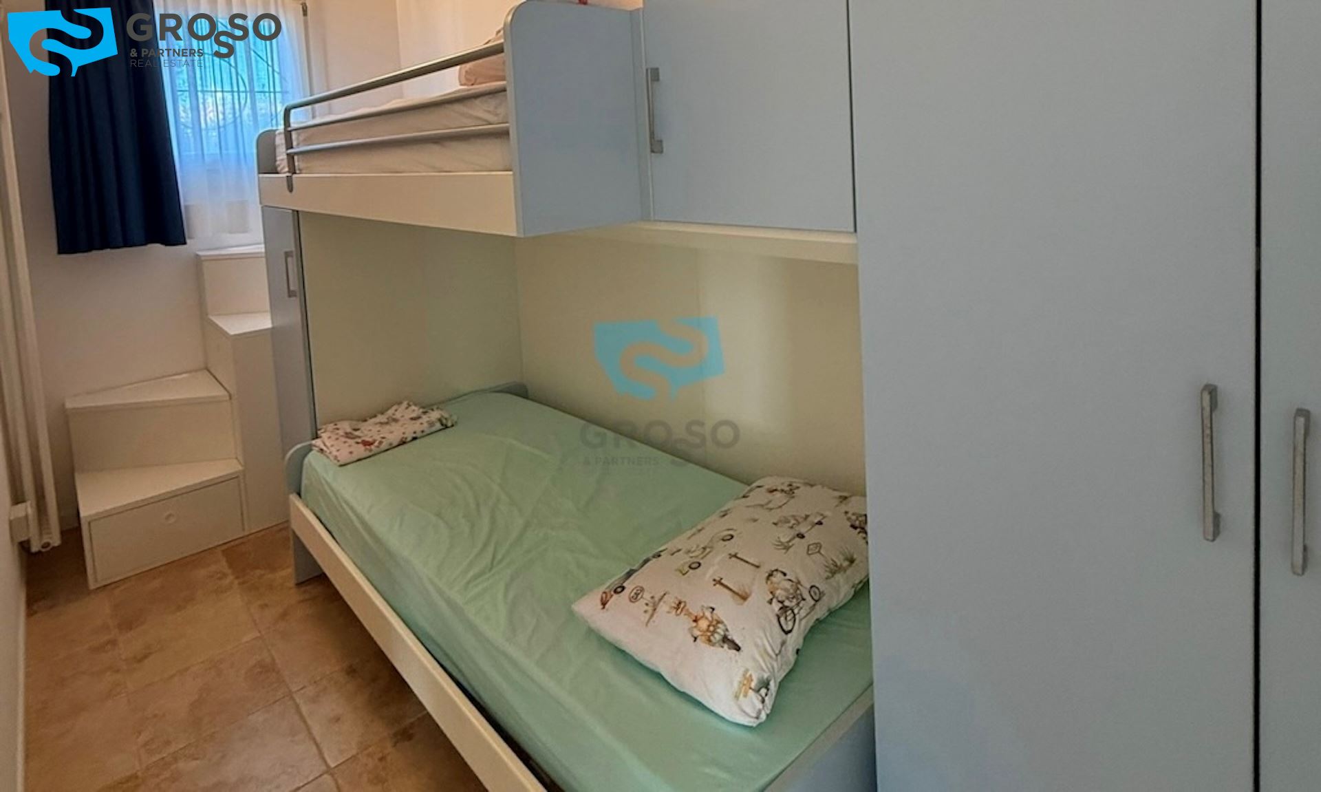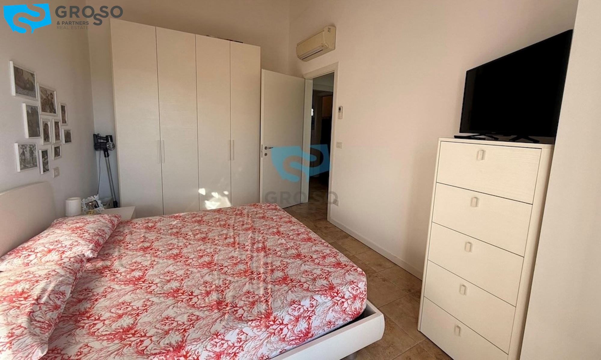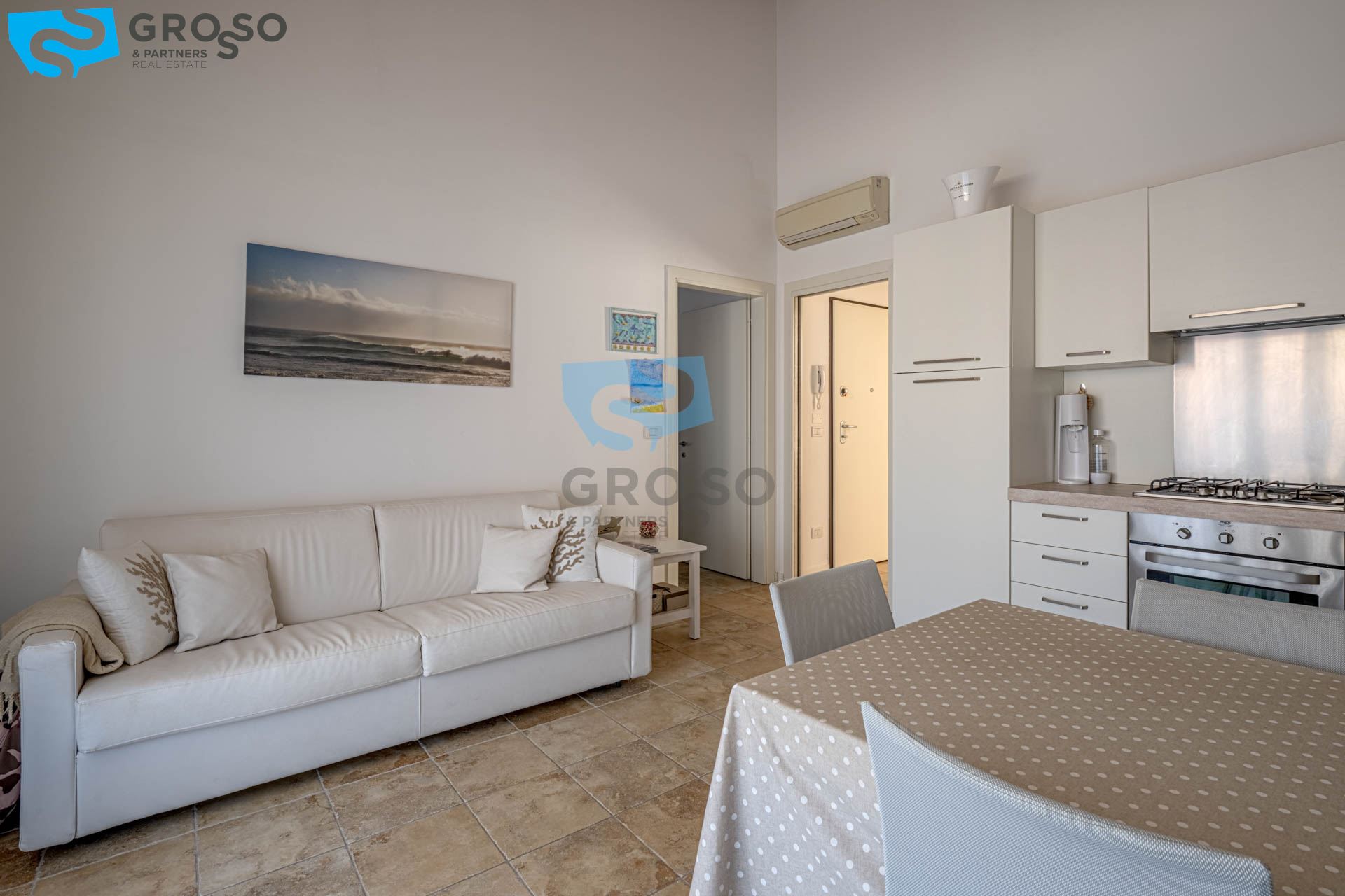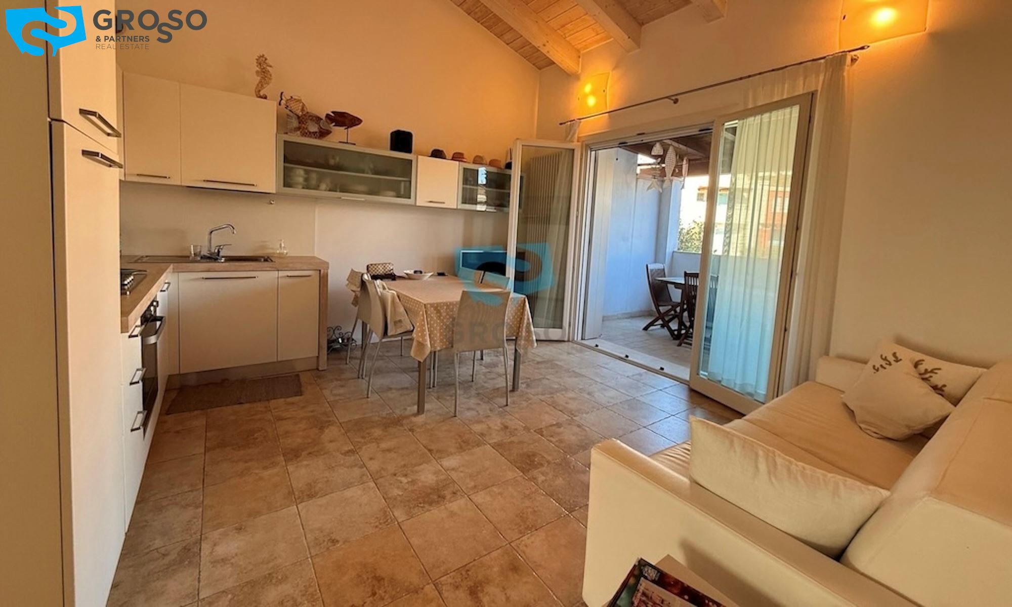 L' immobile è composto da un ampio soggiorno con angolo cottura, perfettamente integrato nella zona living e con accesso diretto alla terrazza coperta, spazio ideale per pranzi e cene all'aperto con affaccio sulla splendida piscina condominiale. La zona notte comprende una camera matrimoniale, una cameretta e un bagno finestrato dotato di tutti i comfort.