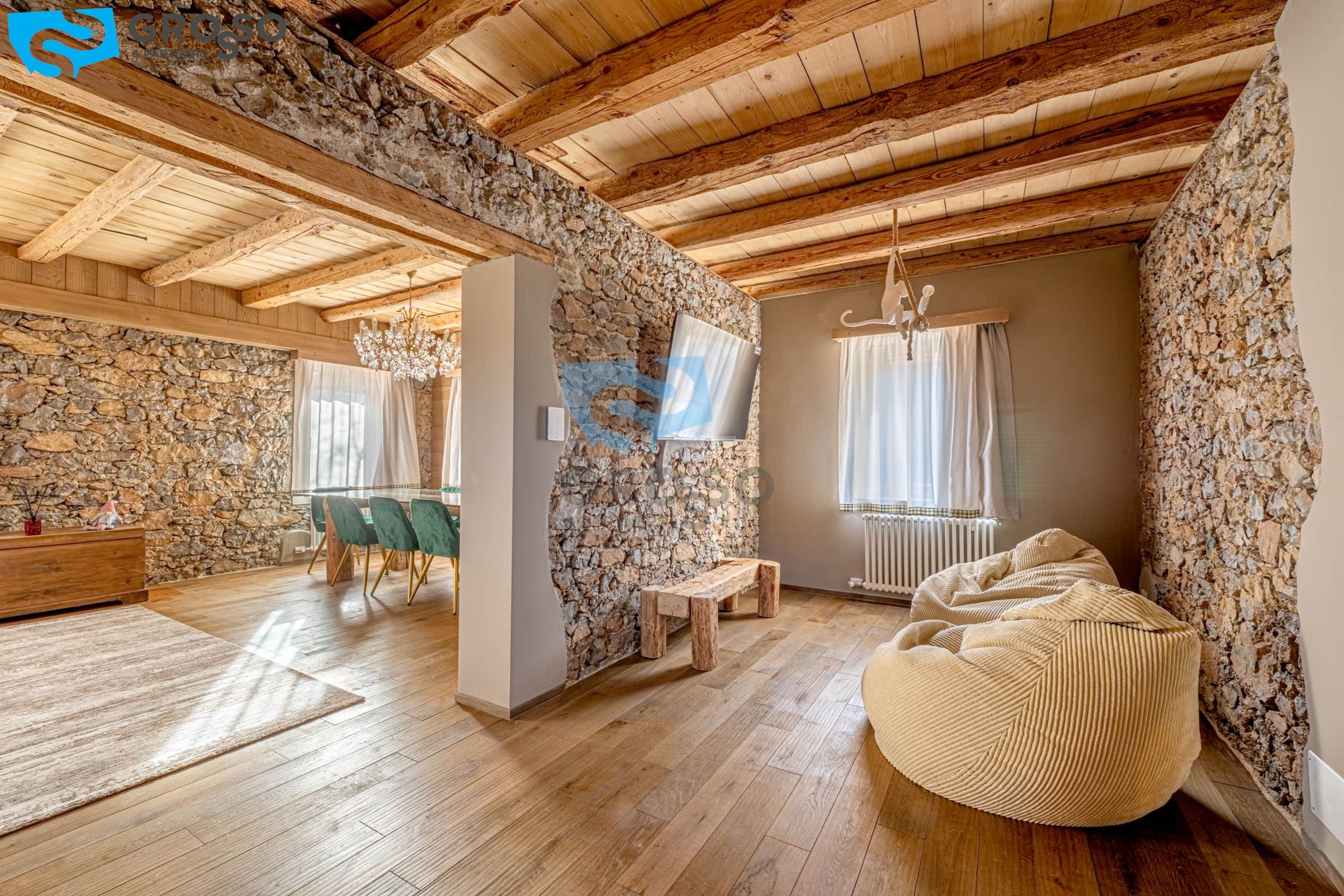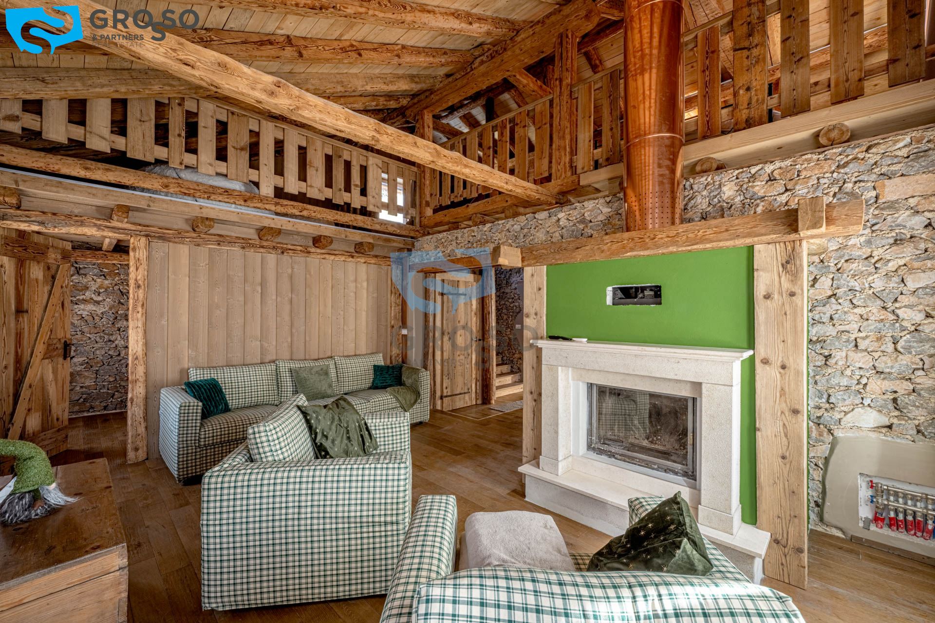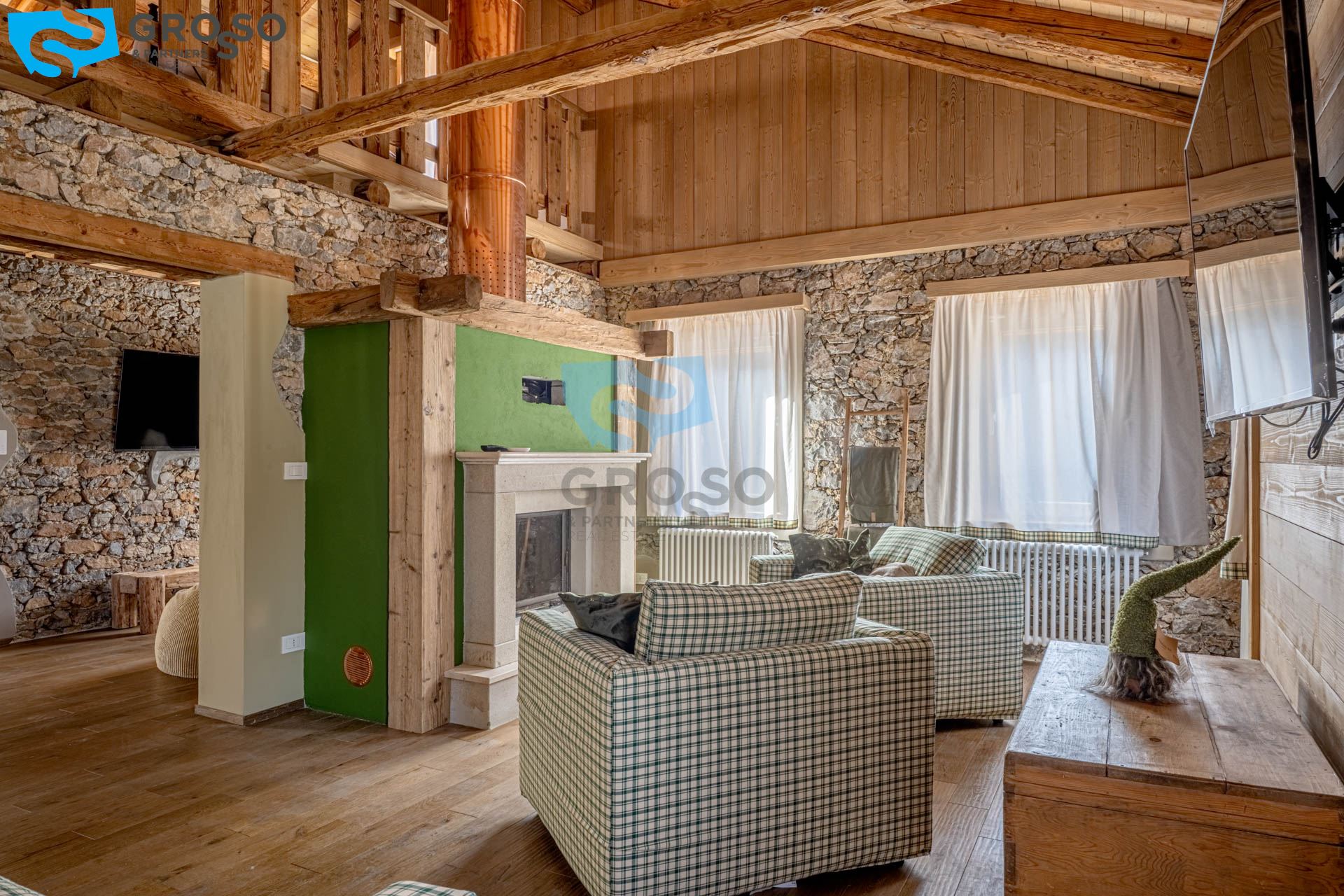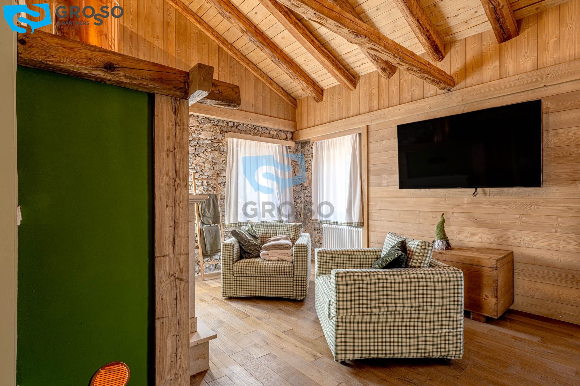 L'ingresso dell'appartamento verde si apre al piano secondo su un soggiorno immenso e arioso, pensato per accogliere pranzi e cene di grandi comitive, dove lo spazio non è mai un limite e la luce naturale diventa protagonista. La cucina, separabile, dialoga con la zona giorno e conduce a un disimpegno organizzato con armadiatura per la lavatrice e a un bagno finestrato. Tornando nel soggiorno, lo sguardo viene catturato dal soffitto a tutt'altezza con travi a vista, vera magia del legno di montagna, che dona carattere e calore all'ambiente. Da qui si accede alla prima camera da letto, intima e silenziosa. Dall'ingresso una scala accompagna al livello superiore, dove si apre una grande mansarda oggi affacciata sul soggiorno, ma facilmente chiudibile per creare maggiore privacy, attualmente adibita a seconda camera.
