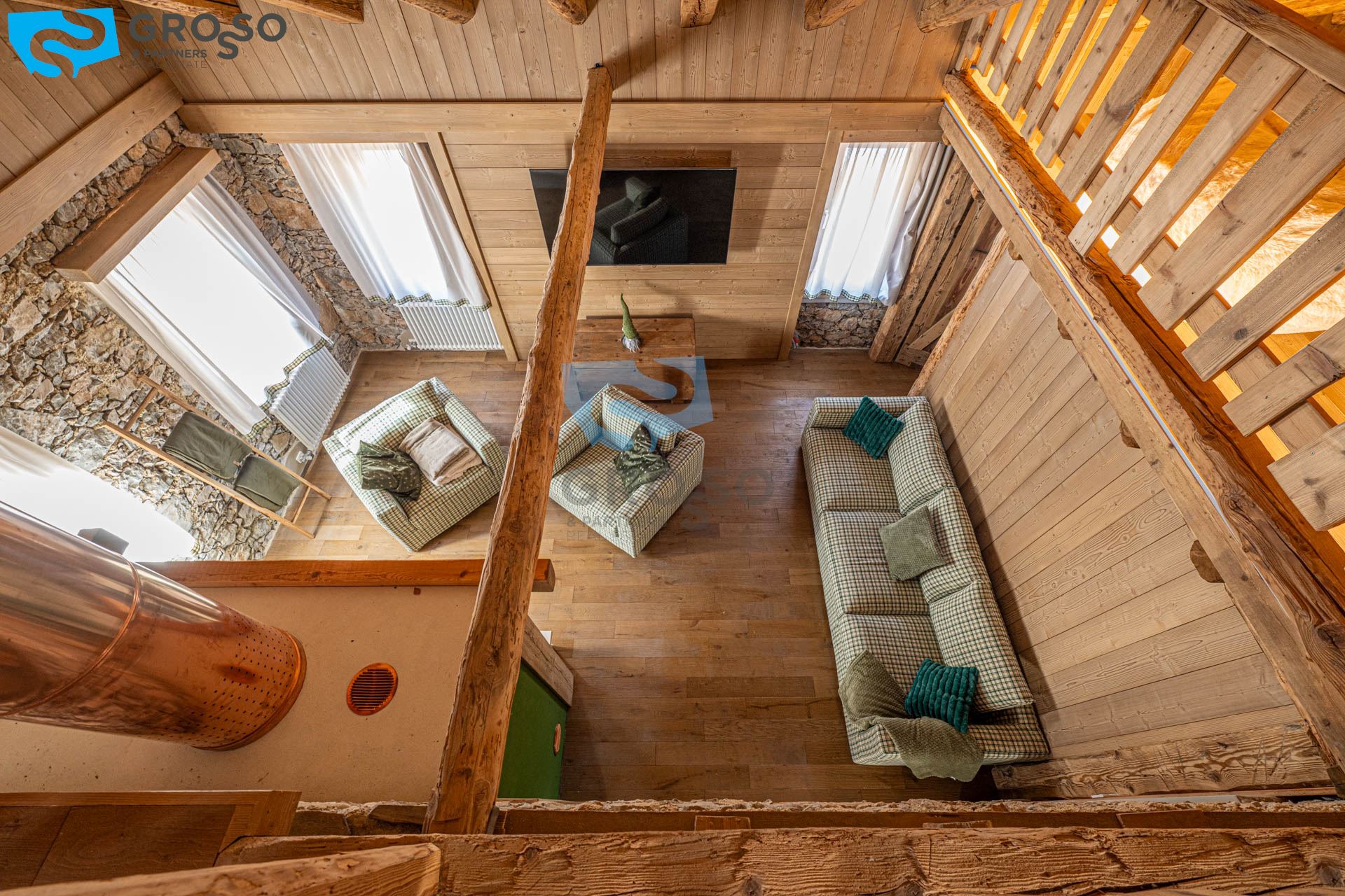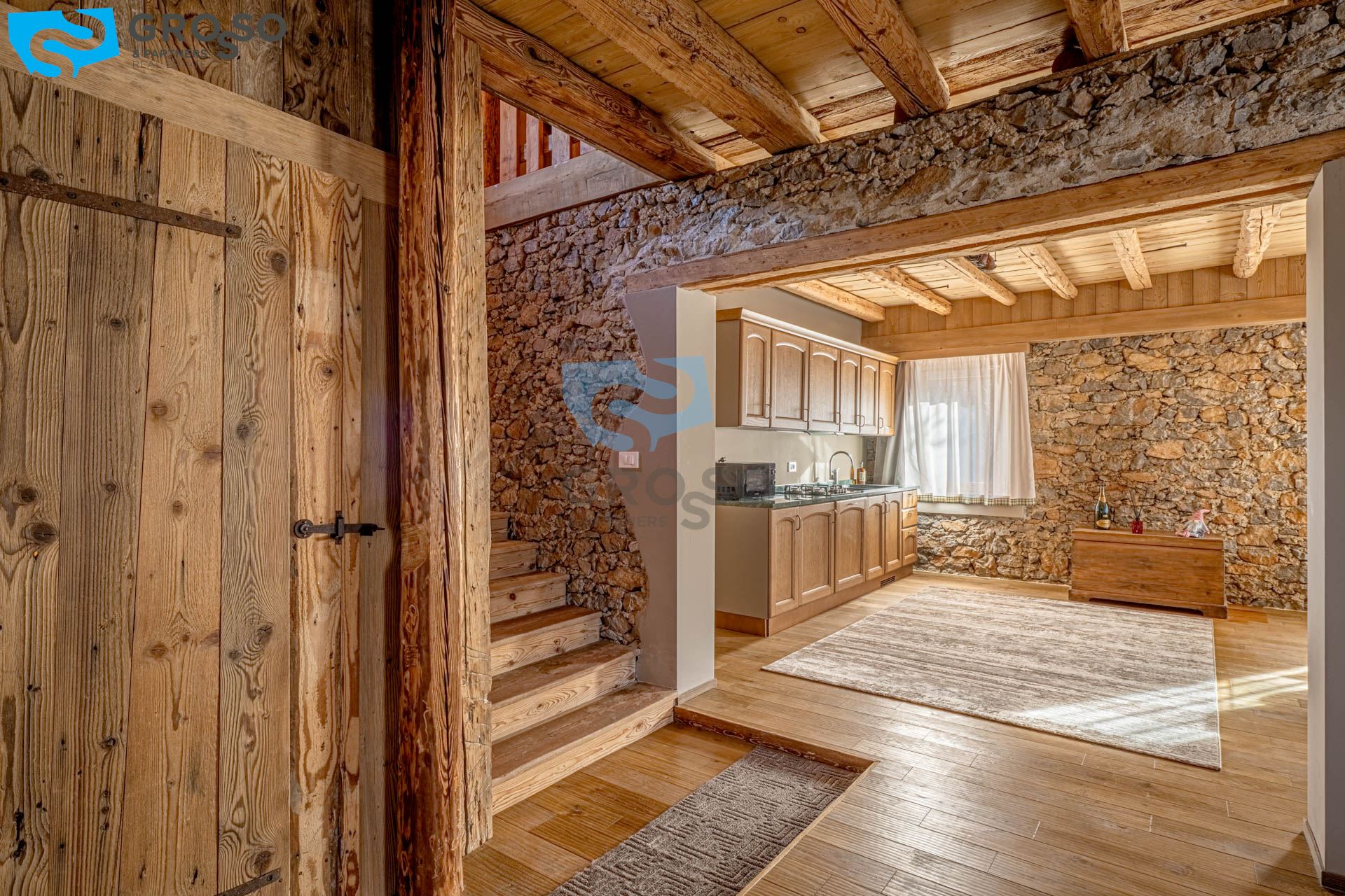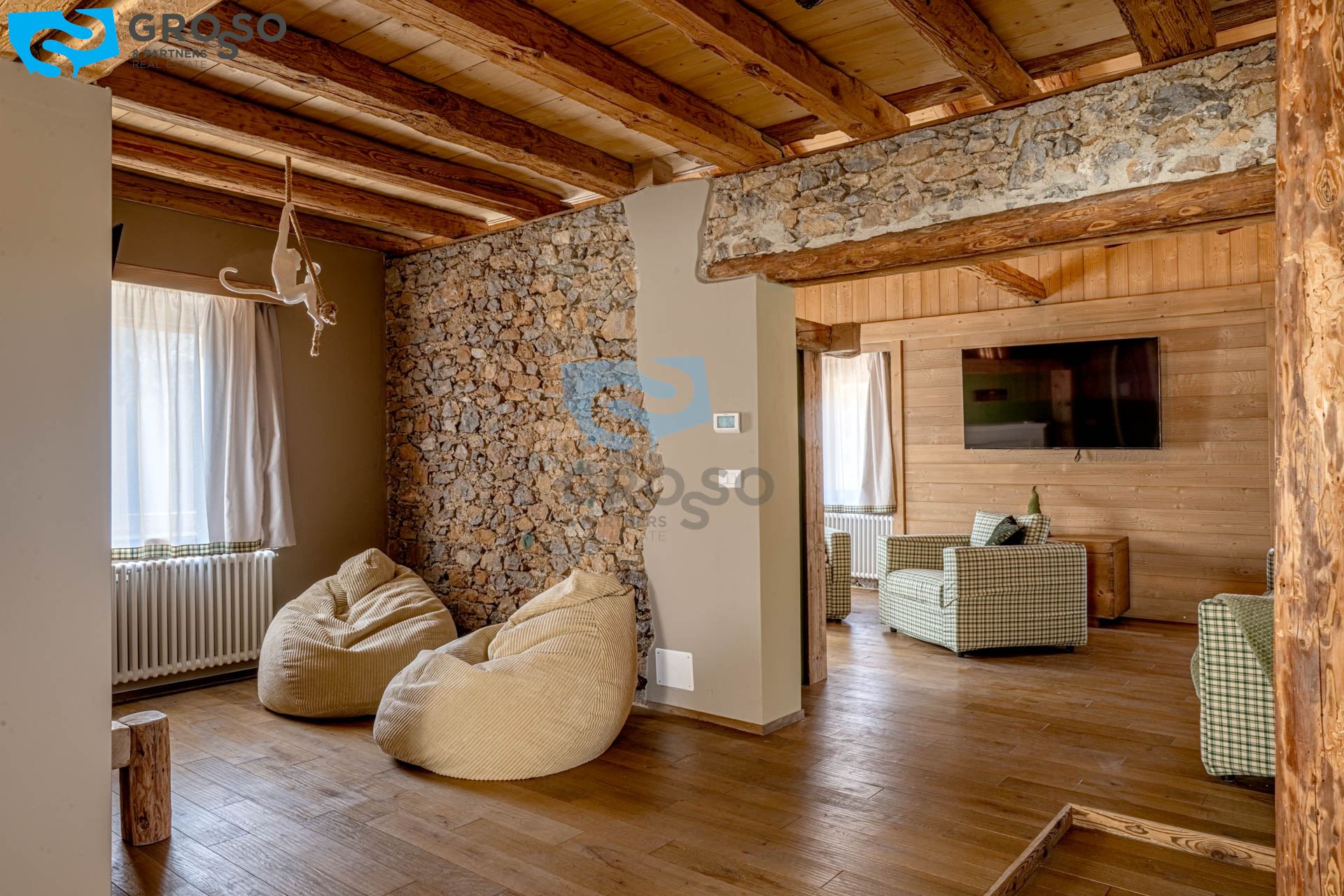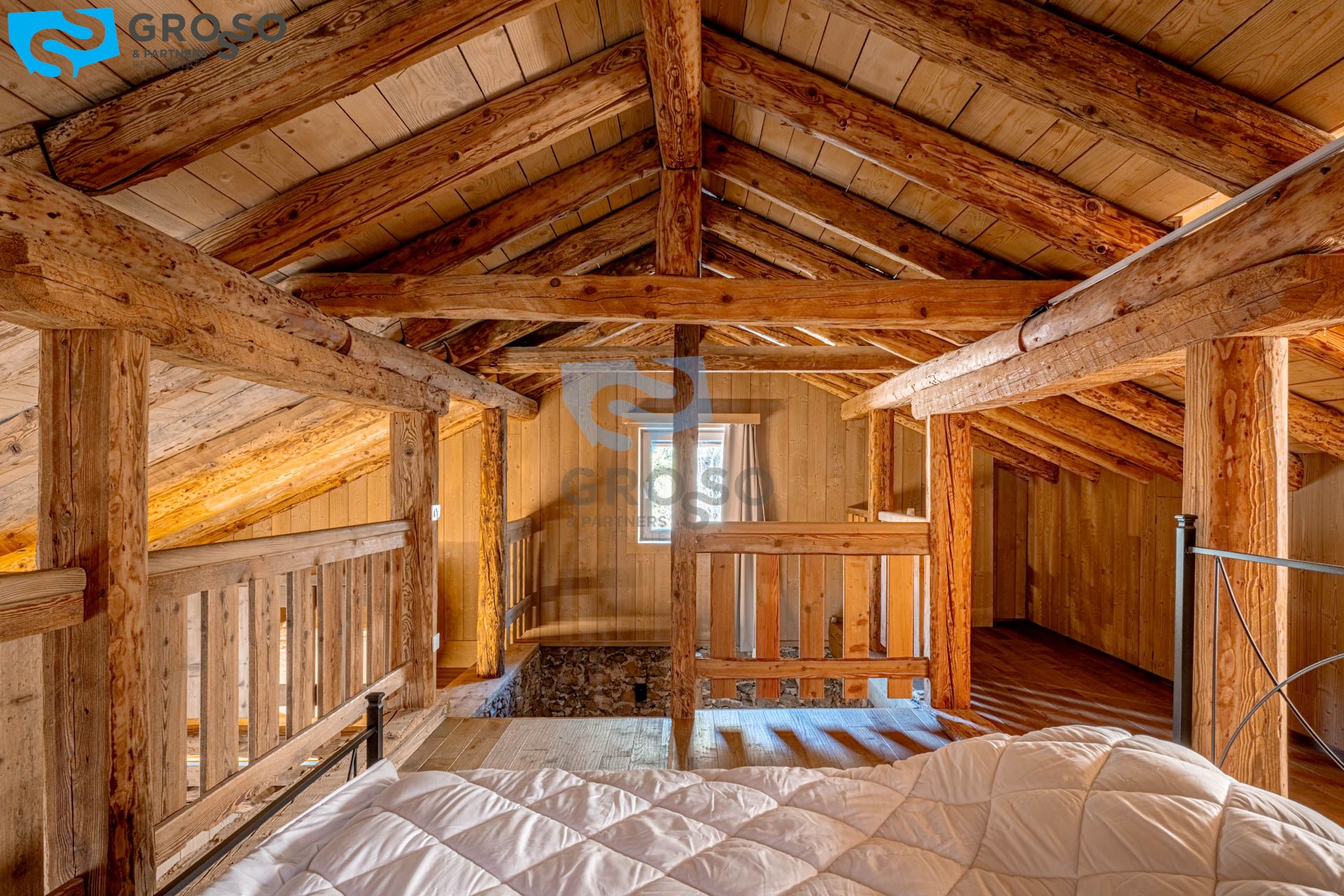 L'ingresso dell'appartamento verde si apre al piano secondo su un soggiorno immenso e arioso, pensato per accogliere pranzi e cene di grandi comitive, dove lo spazio non è mai un limite e la luce naturale diventa protagonista. La cucina, separabile, dialoga con la zona giorno e conduce a un disimpegno organizzato con armadiatura per la lavatrice e a un bagno finestrato. Tornando nel soggiorno, lo sguardo viene catturato dal soffitto a tutt'altezza con travi a vista, vera magia del legno di montagna, che dona carattere e calore all'ambiente. Da qui si accede alla prima camera da letto, intima e silenziosa. Dall'ingresso una scala accompagna al livello superiore, dove si apre una grande mansarda oggi affacciata sul soggiorno, ma facilmente chiudibile per creare maggiore privacy, attualmente adibita a seconda camera.