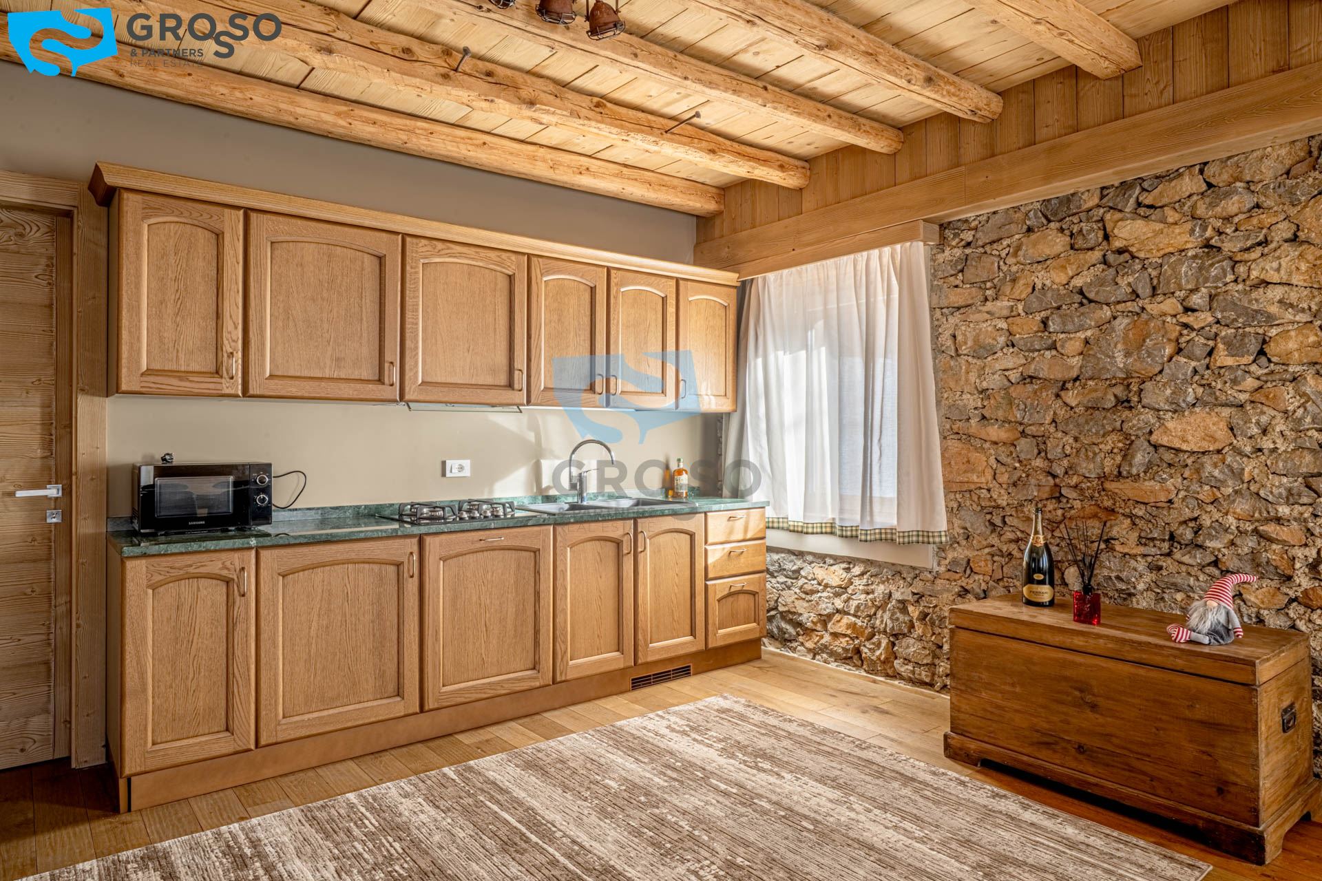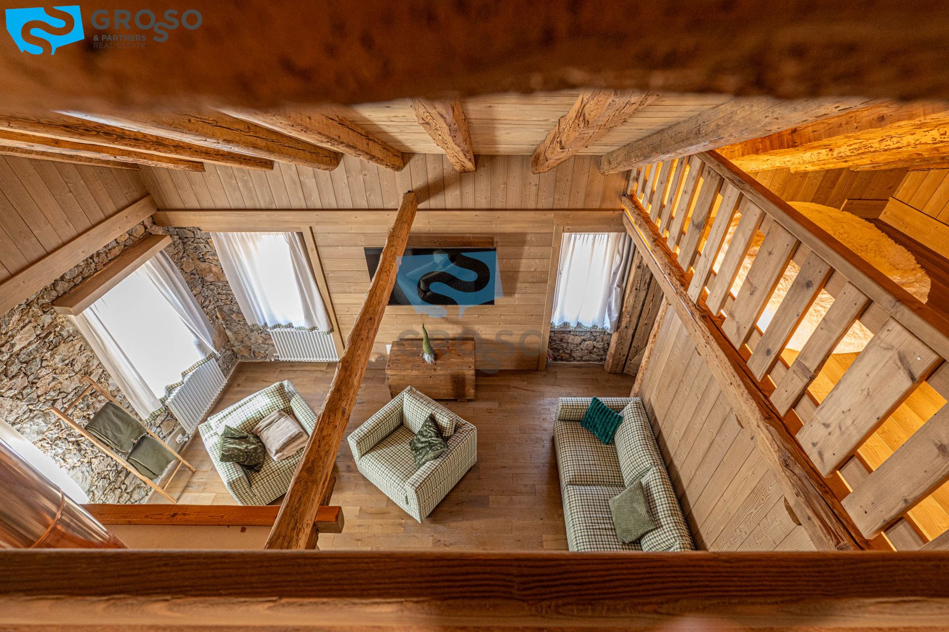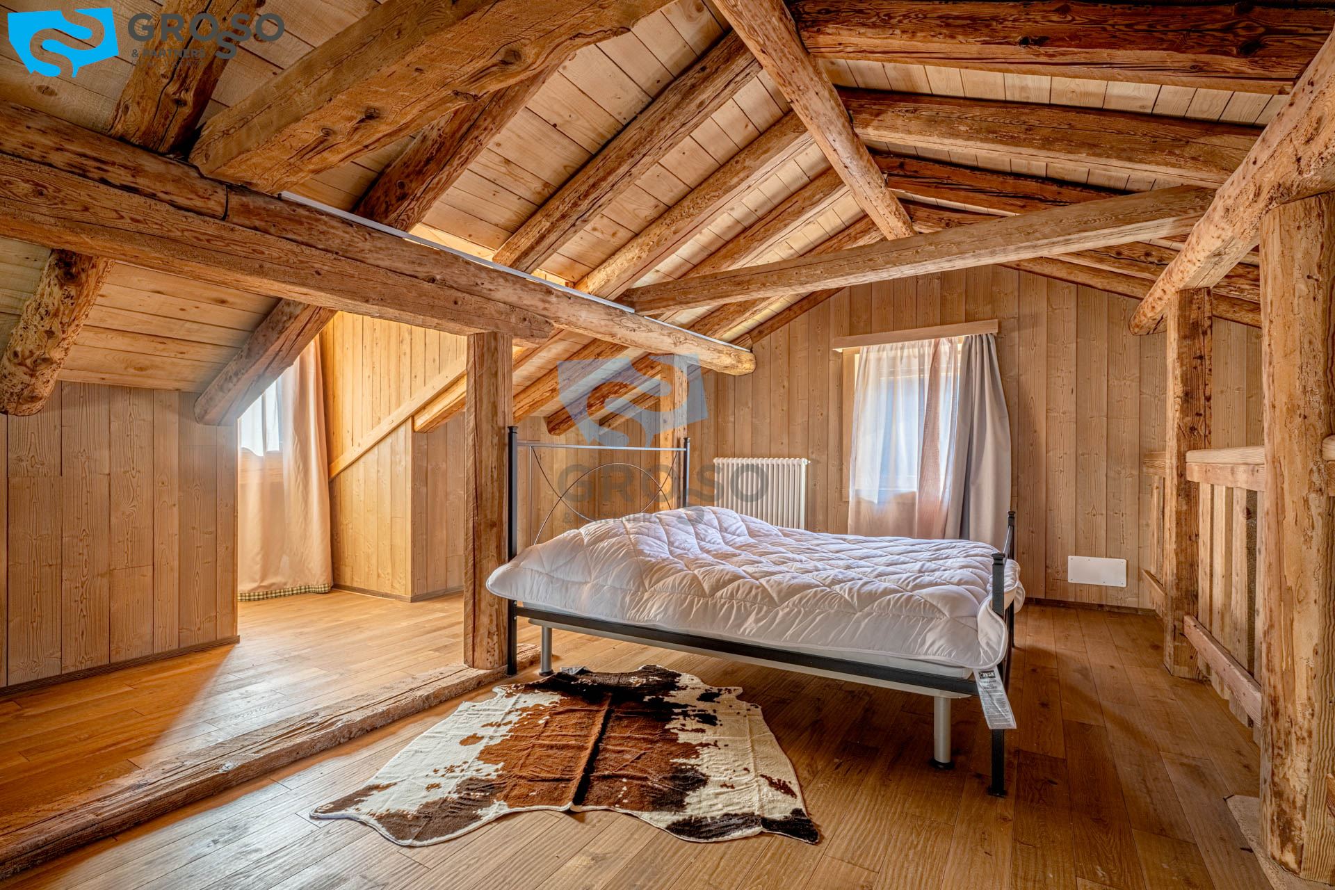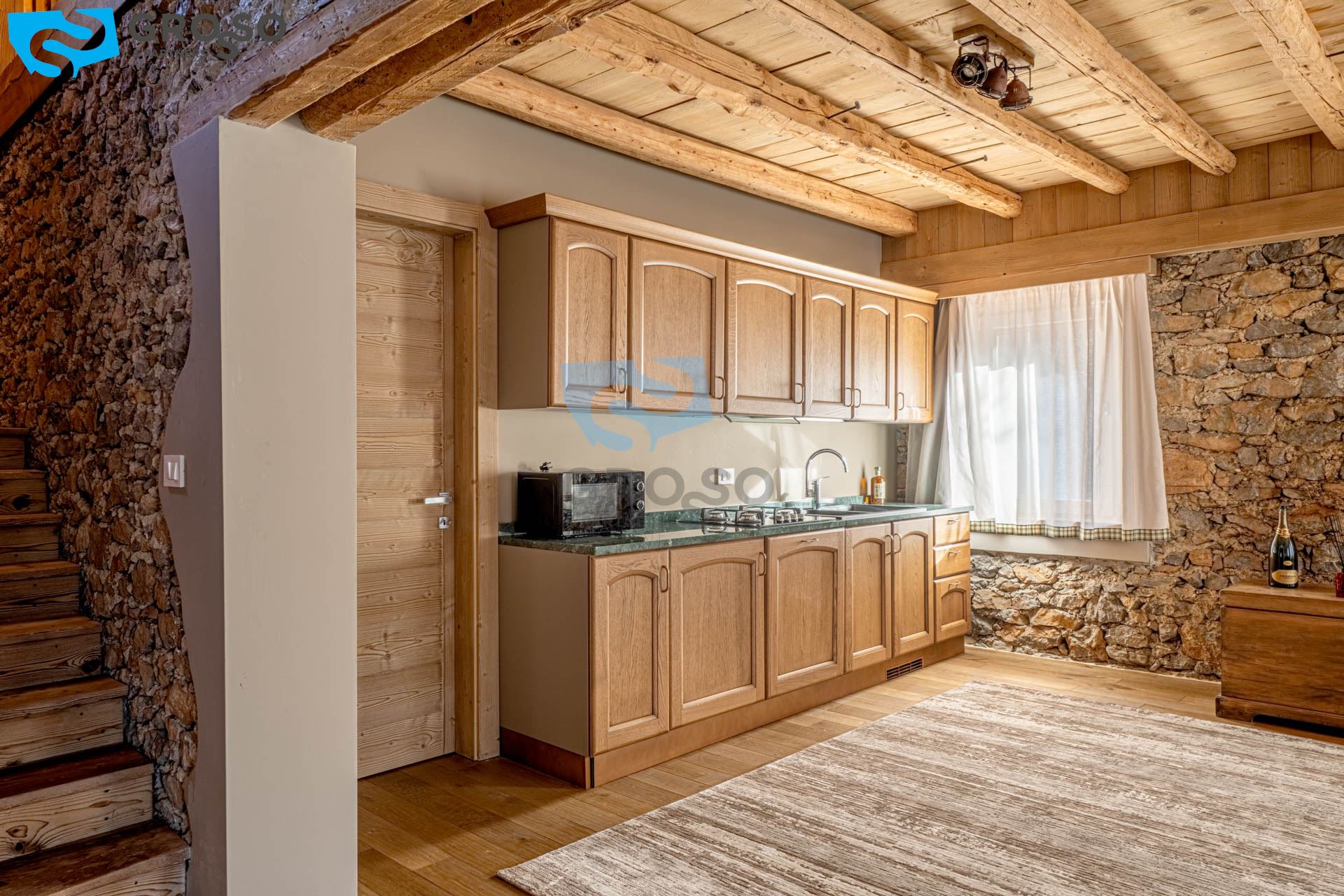 L'ingresso dell'appartamento verde si apre al piano secondo su un soggiorno immenso e arioso, pensato per accogliere pranzi e cene di grandi comitive, dove lo spazio non è mai un limite e la luce naturale diventa protagonista. La cucina, separabile, dialoga con la zona giorno e conduce a un disimpegno organizzato con armadiatura per la lavatrice e a un bagno finestrato. Tornando nel soggiorno, lo sguardo viene catturato dal soffitto a tutt'altezza con travi a vista, vera magia del legno di montagna, che dona carattere e calore all'ambiente. Da qui si accede alla prima camera da letto, intima e silenziosa. Dall'ingresso una scala accompagna al livello superiore, dove si apre una grande mansarda oggi affacciata sul soggiorno, ma facilmente chiudibile per creare maggiore privacy, attualmente adibita a seconda camera.