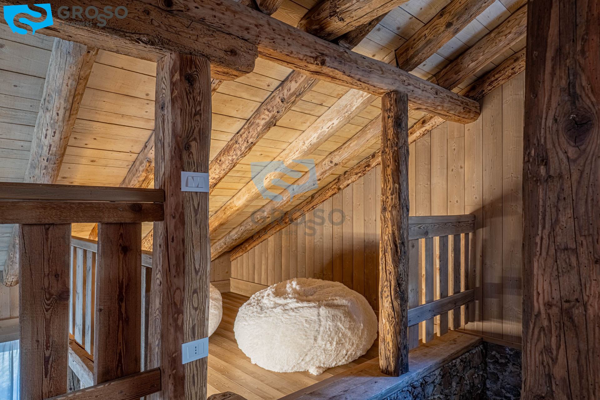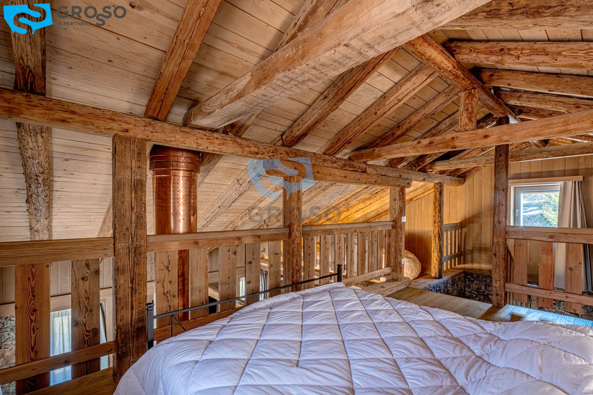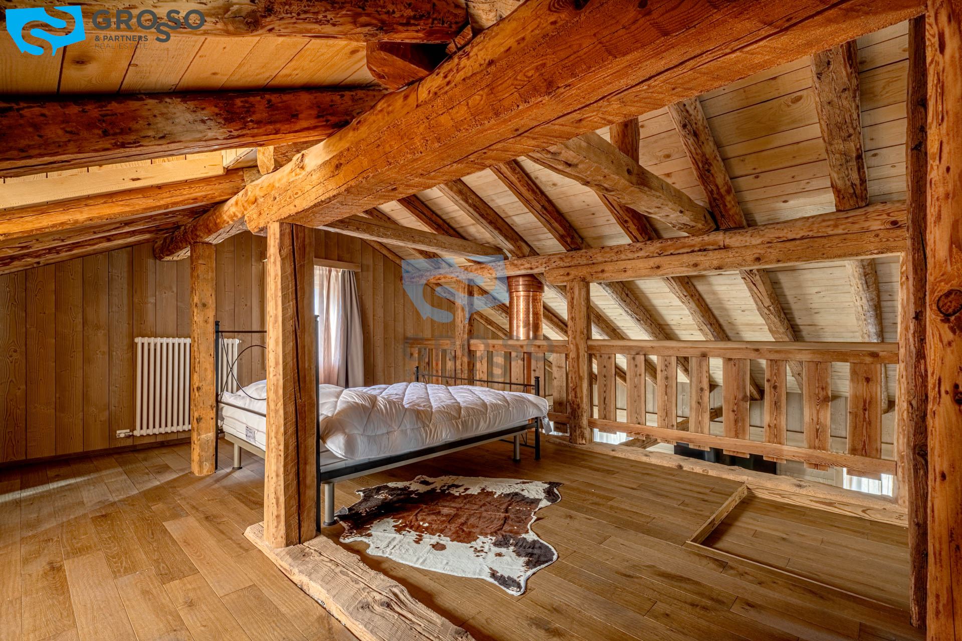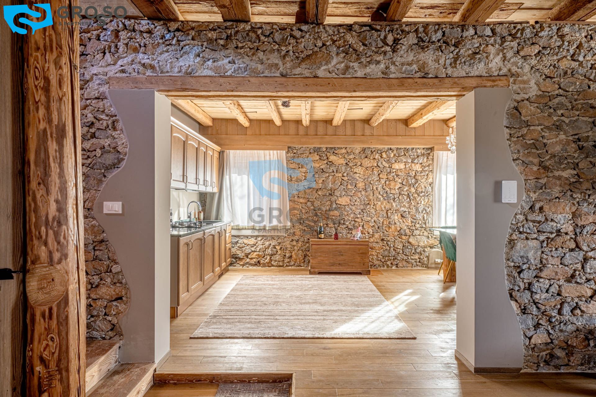 L'ingresso dell'appartamento verde si apre al piano secondo su un soggiorno immenso e arioso, pensato per accogliere pranzi e cene di grandi comitive, dove lo spazio non è mai un limite e la luce naturale diventa protagonista. La cucina, separabile, dialoga con la zona giorno e conduce a un disimpegno organizzato con armadiatura per la lavatrice e a un bagno finestrato. Tornando nel soggiorno, lo sguardo viene catturato dal soffitto a tutt'altezza con travi a vista, vera magia del legno di montagna, che dona carattere e calore all'ambiente. Da qui si accede alla prima camera da letto, intima e silenziosa. Dall'ingresso una scala accompagna al livello superiore, dove si apre una grande mansarda oggi affacciata sul soggiorno, ma facilmente chiudibile per creare maggiore privacy, attualmente adibita a seconda camera.