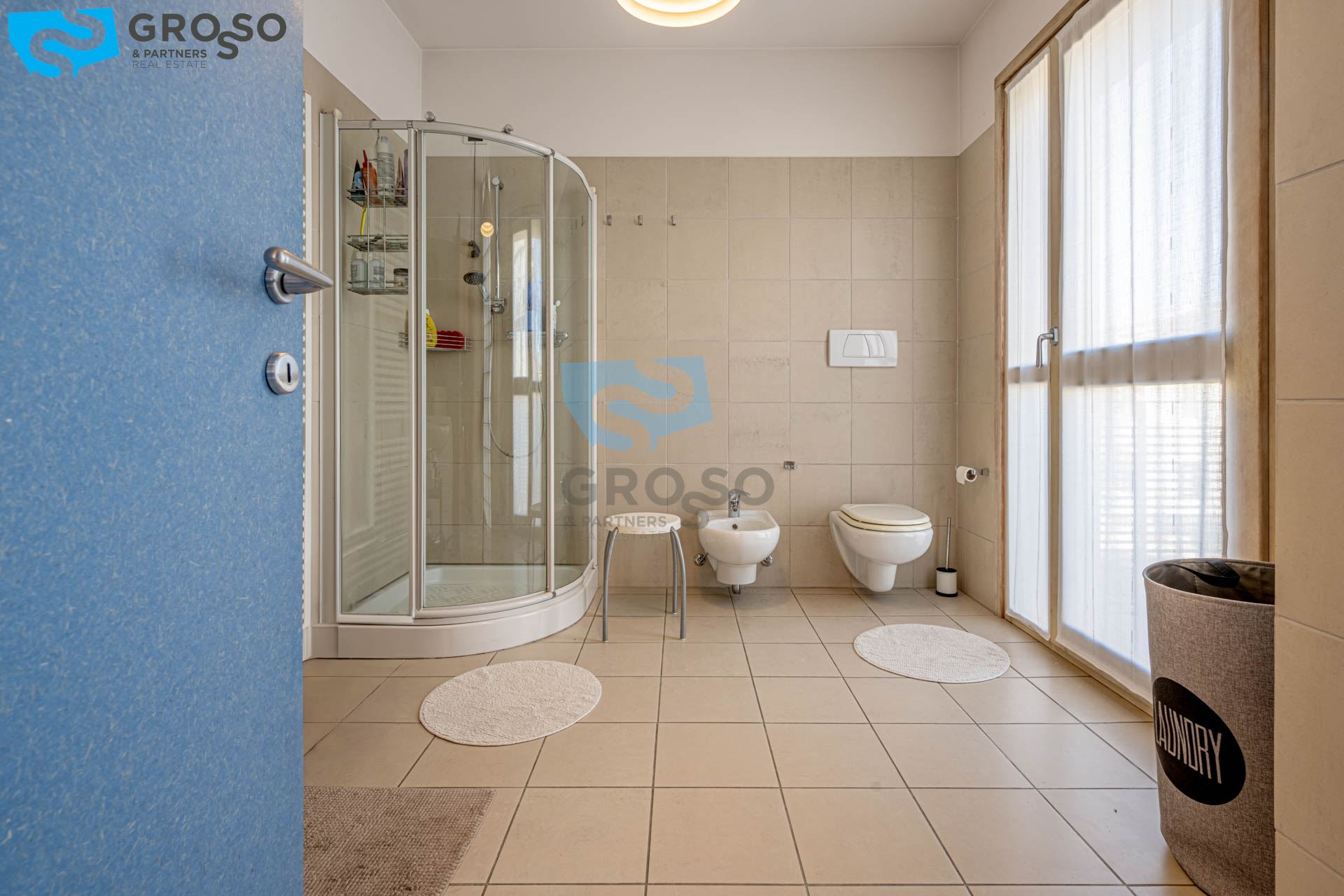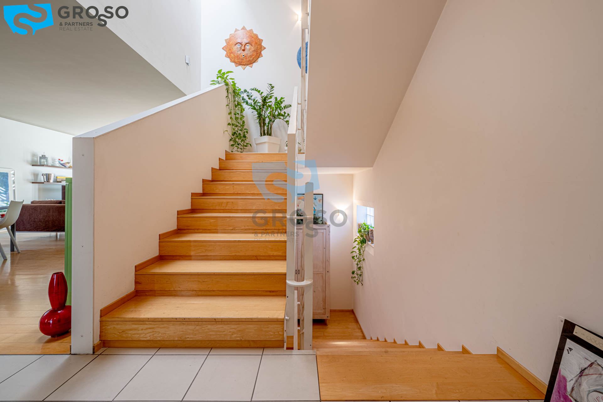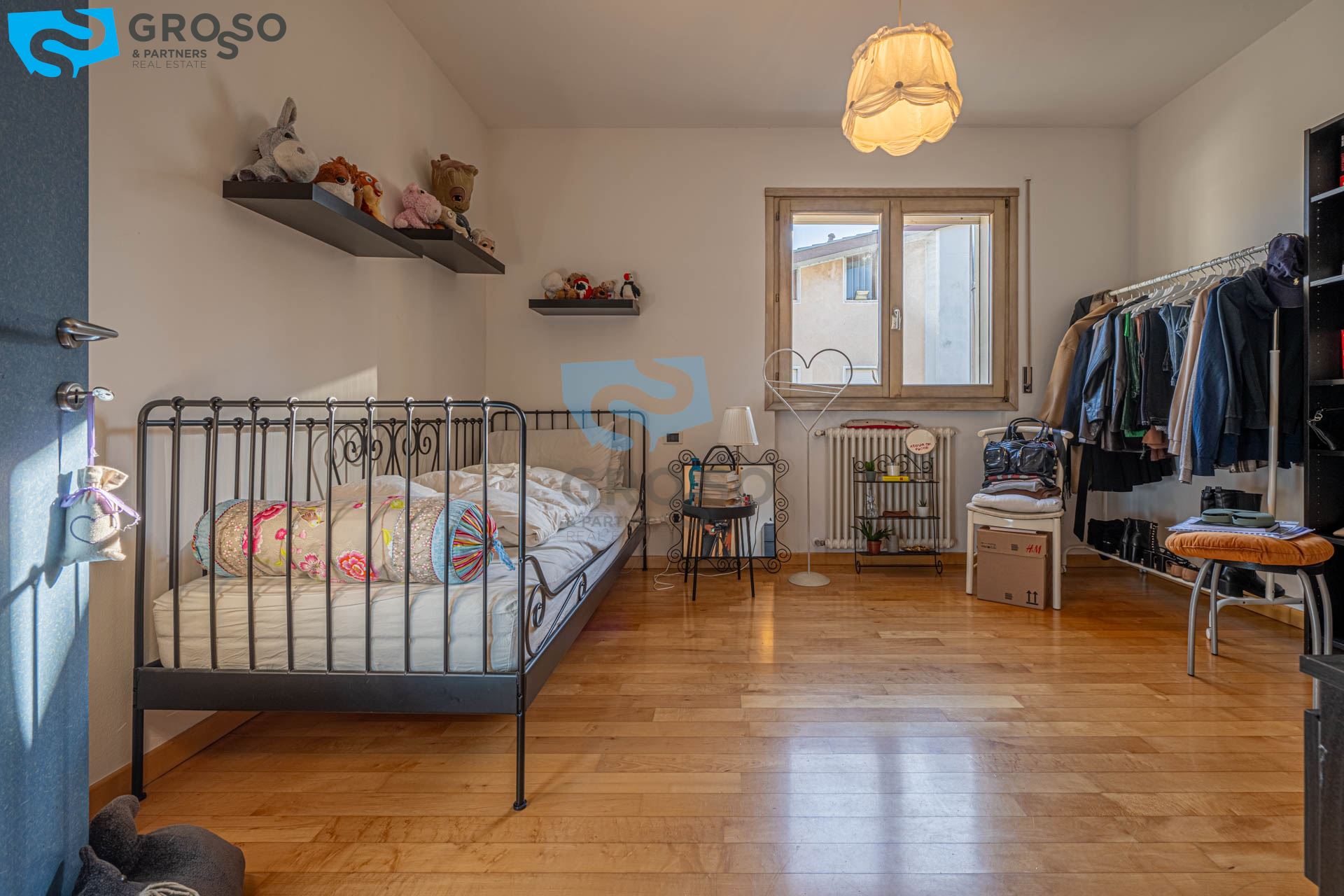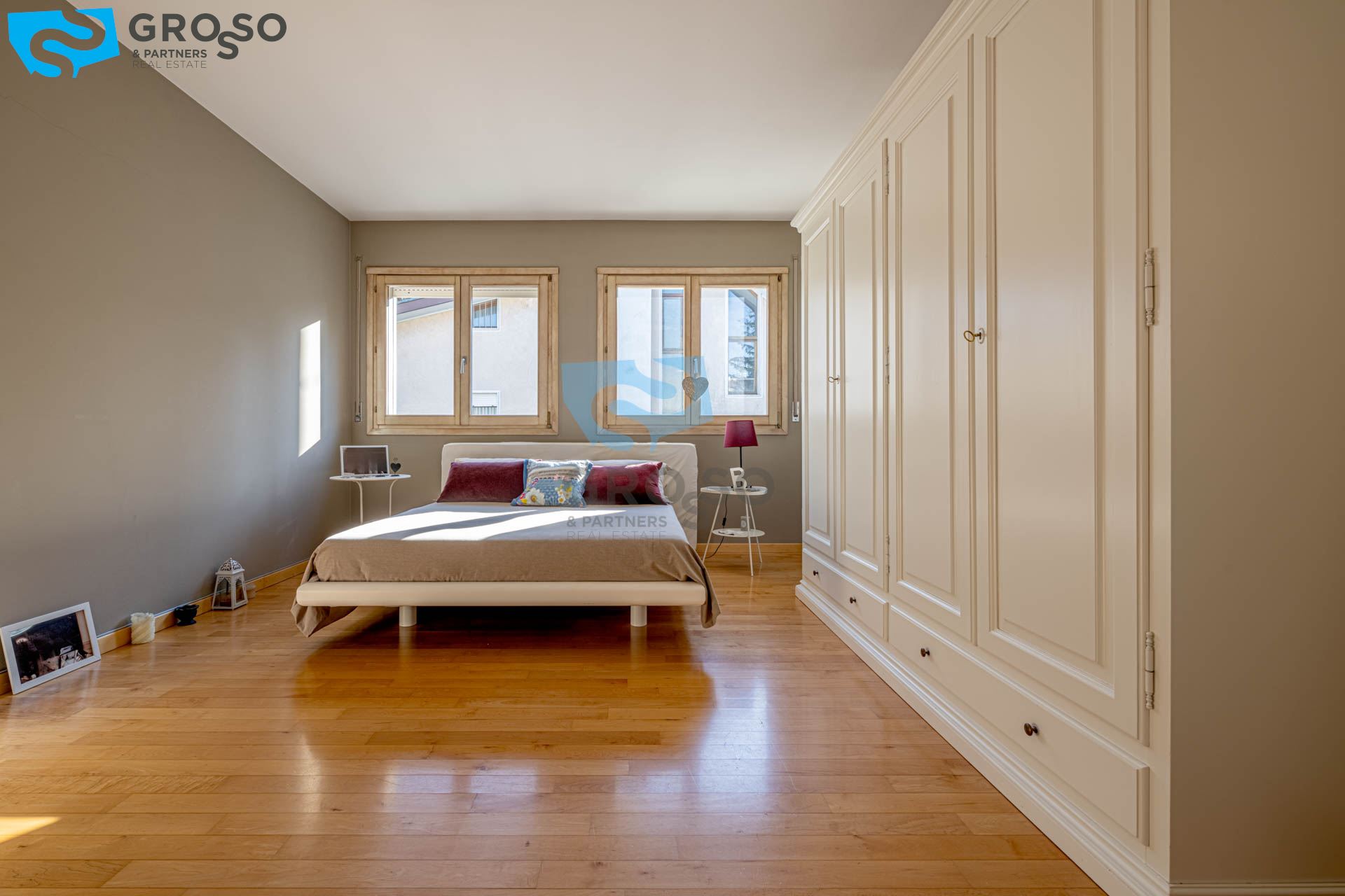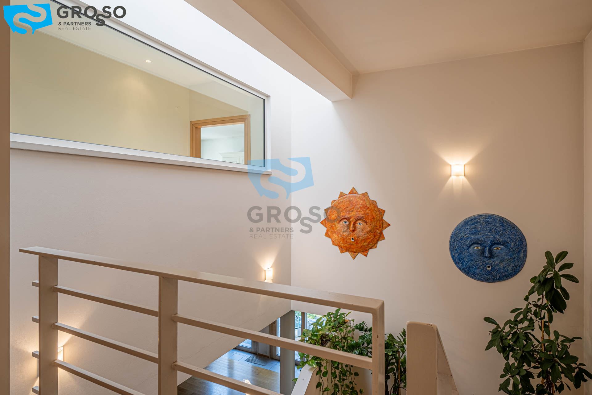 Il piano superiore ospita tre camere da letto, di cui una matrimoniale con bagno padronale, due camere doppie offrono spazio sufficiente per ospiti o membri della famiglia, mentre un ulteriore bagno e un ripostiglio completano questo livello con praticità e stile.