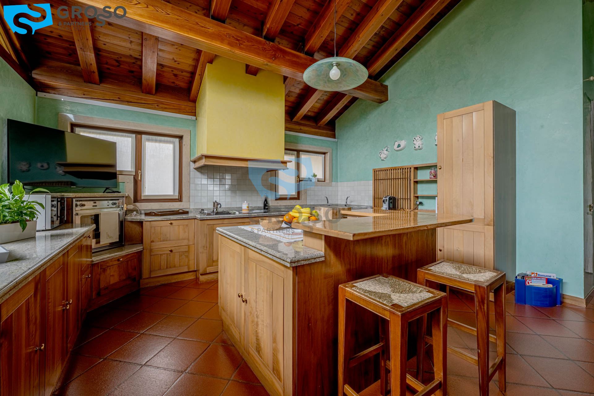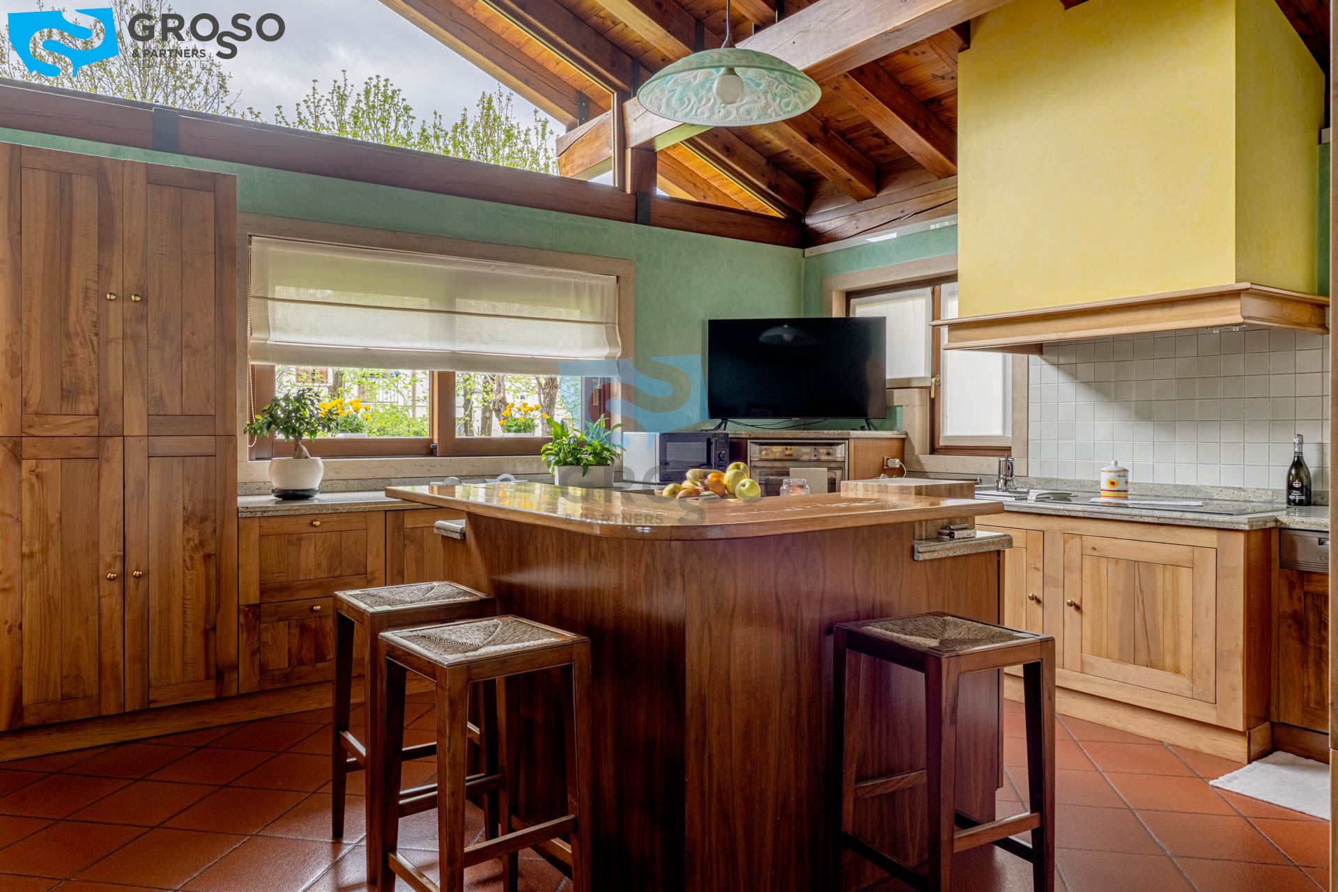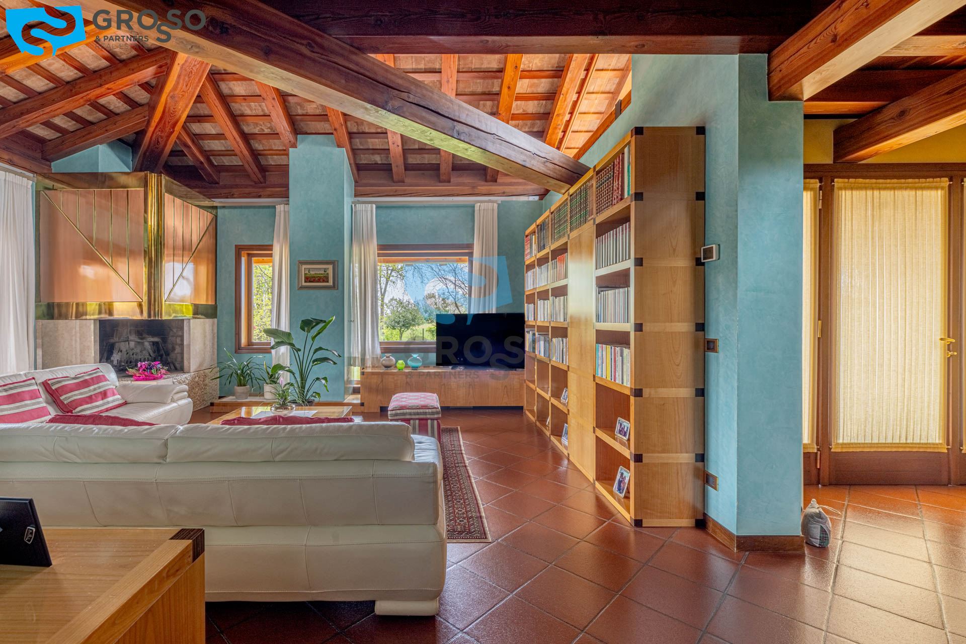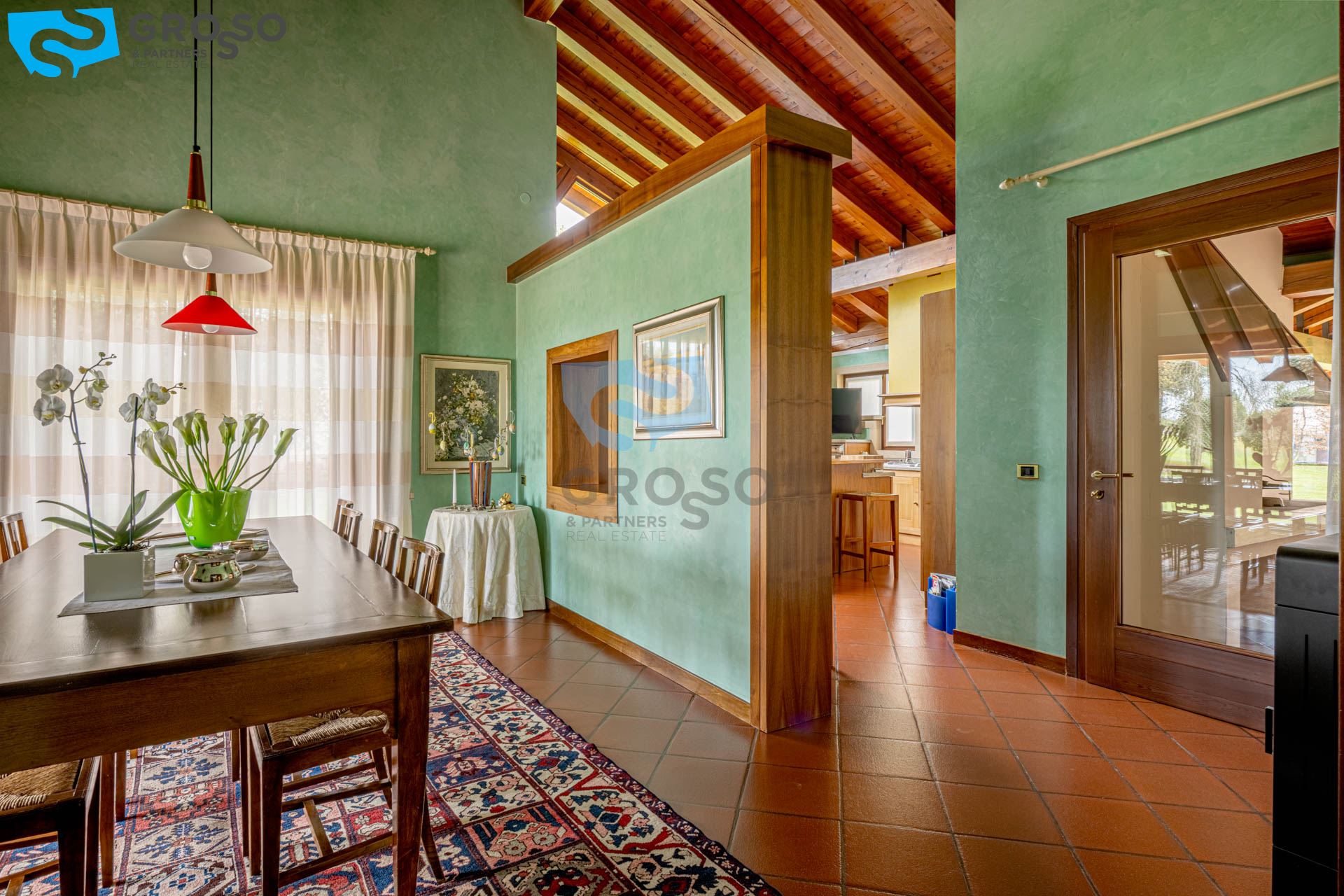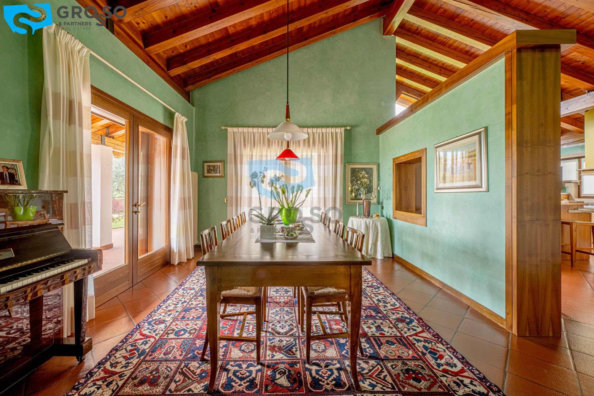 Da un elegante vialetto esterno accediamo all'ingresso della villa, dove troviamo un ampio soggiorno con caminetto impreziosito da grandi vetrate con vista panoramica, una generosa sala da pranzo, una cucina abitabile con accesso che da al caminetto esterno dove si trova la zona barbecue e un bagno di servizio.
