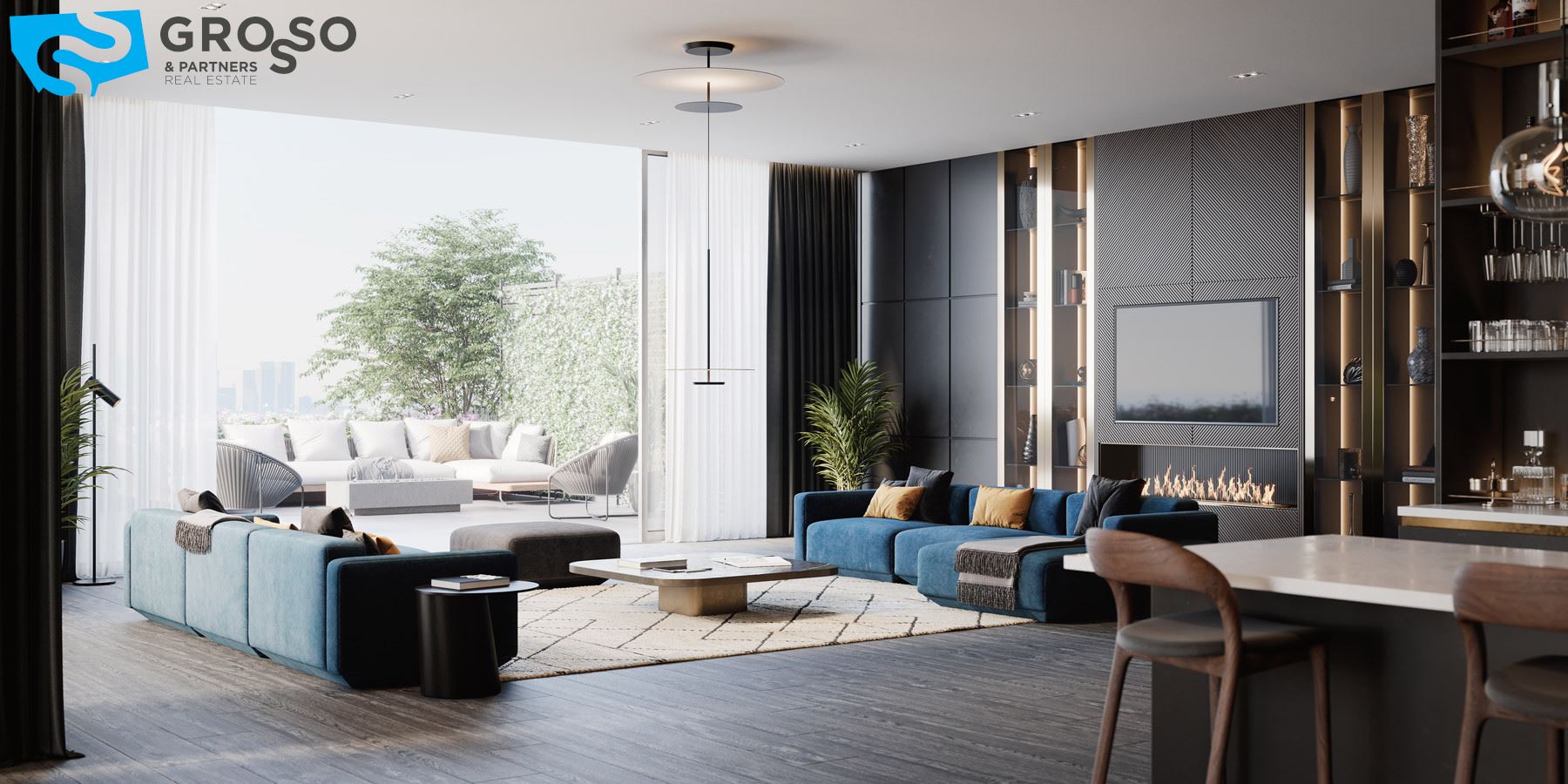 L'abitazione si sviluppa su un unico livello per una superficie interna generosa e ben distribuita. L'ingresso si apre su una luminosa zona giorno open space di 58 mq, composta da soggiorno, zona pranzo e cucina a vista, con accesso diretto alla spettacolare terrazza abitabile di 80 mq che abbraccia l'intero perimetro dell'appartamento, ideale per vivere momenti di relax all'aperto o per ricevere ospiti.