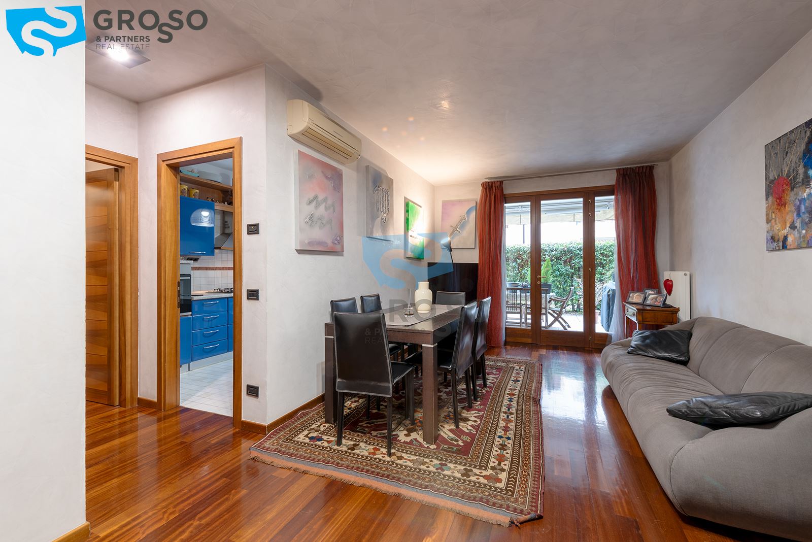 L'immobile si trova al piano terra e gode di un ampio giardino privato disposto su tre lati, ideale per momenti di relax all'aperto. L'abitazione è composta da luminoso soggiorno-pranzo, cucina separata, tre camere da letto, comodo ripostiglio e due bagni.