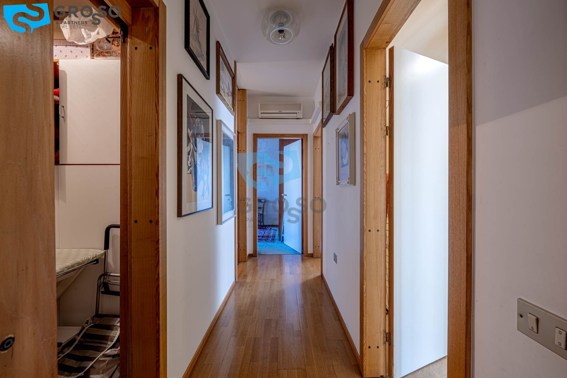 L'ingresso conduce alla cucina separata e a un comodo disimpegno che distribuisce in modo ordinato la zona notte dove troviamo tre bagni finestrati, una pratica lavanderia e tre camere da letto, di cui due matrimoniali dalle dimensioni importanti e una terza camera ideale come stanza singola, studio o camera ospiti.
